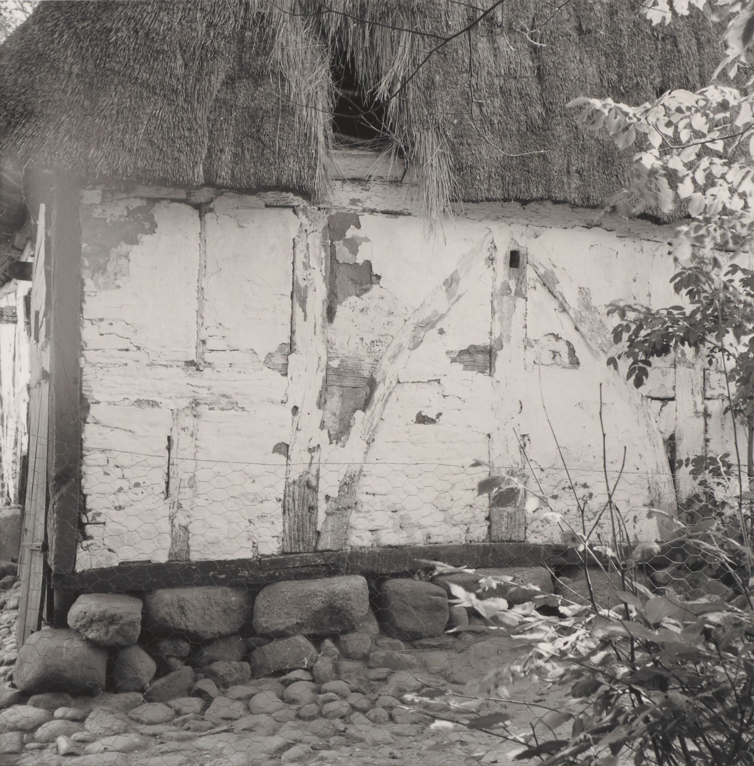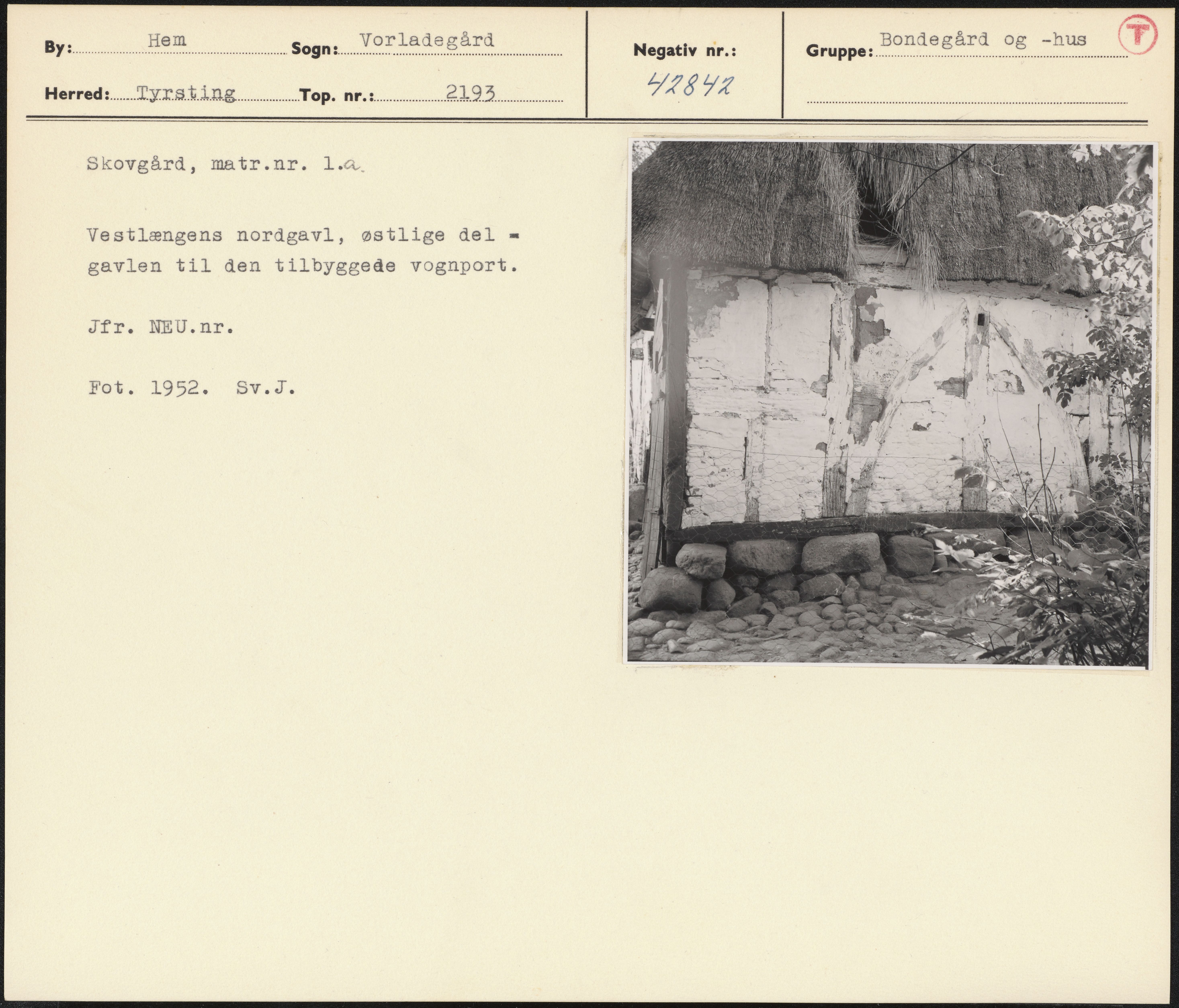 Maskingenkendt tekst fra arkivkort. Skovgård, matr.nr. 1.a. Vestlængens nordgavl, østlige del = gavlen til den tilbyggede vognport. Jfr. NEU.nr. Fot. 1952. Sv.J.