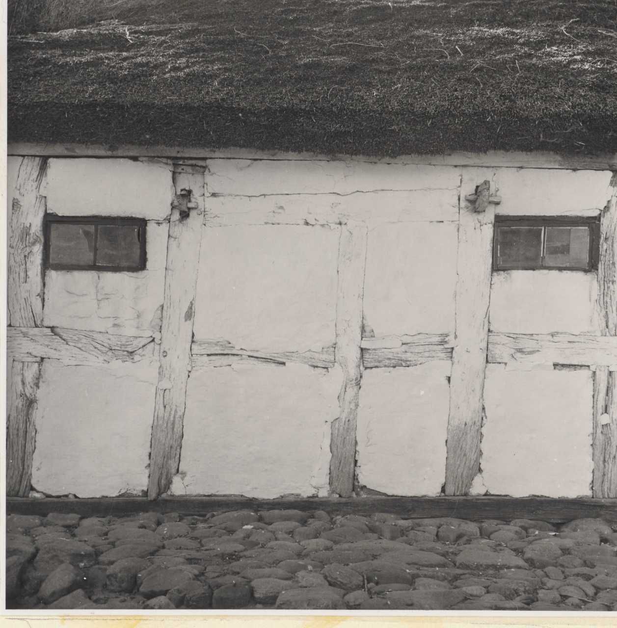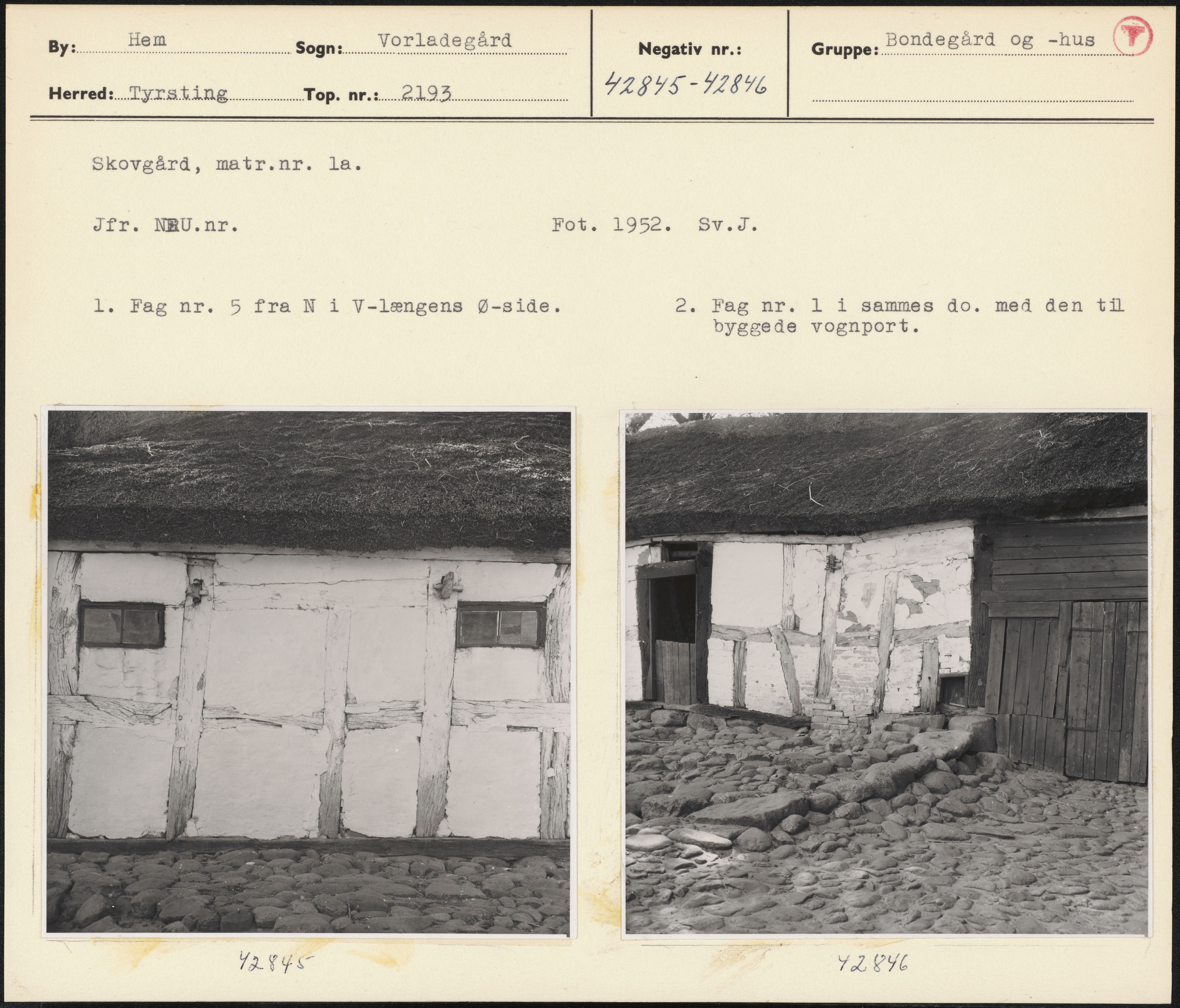 Maskingenkendt tekst fra arkivkort. Skovgård, matr.nr. la. Jfr. NBU.nr. Fot. 1952. BSv.J. 1. Fag nr. 5 fra N i V-længens Ø-side. 2. Fag nr. 1 i sammes do. med den til byggede vognport. 19. Y 48 1/08 76