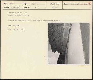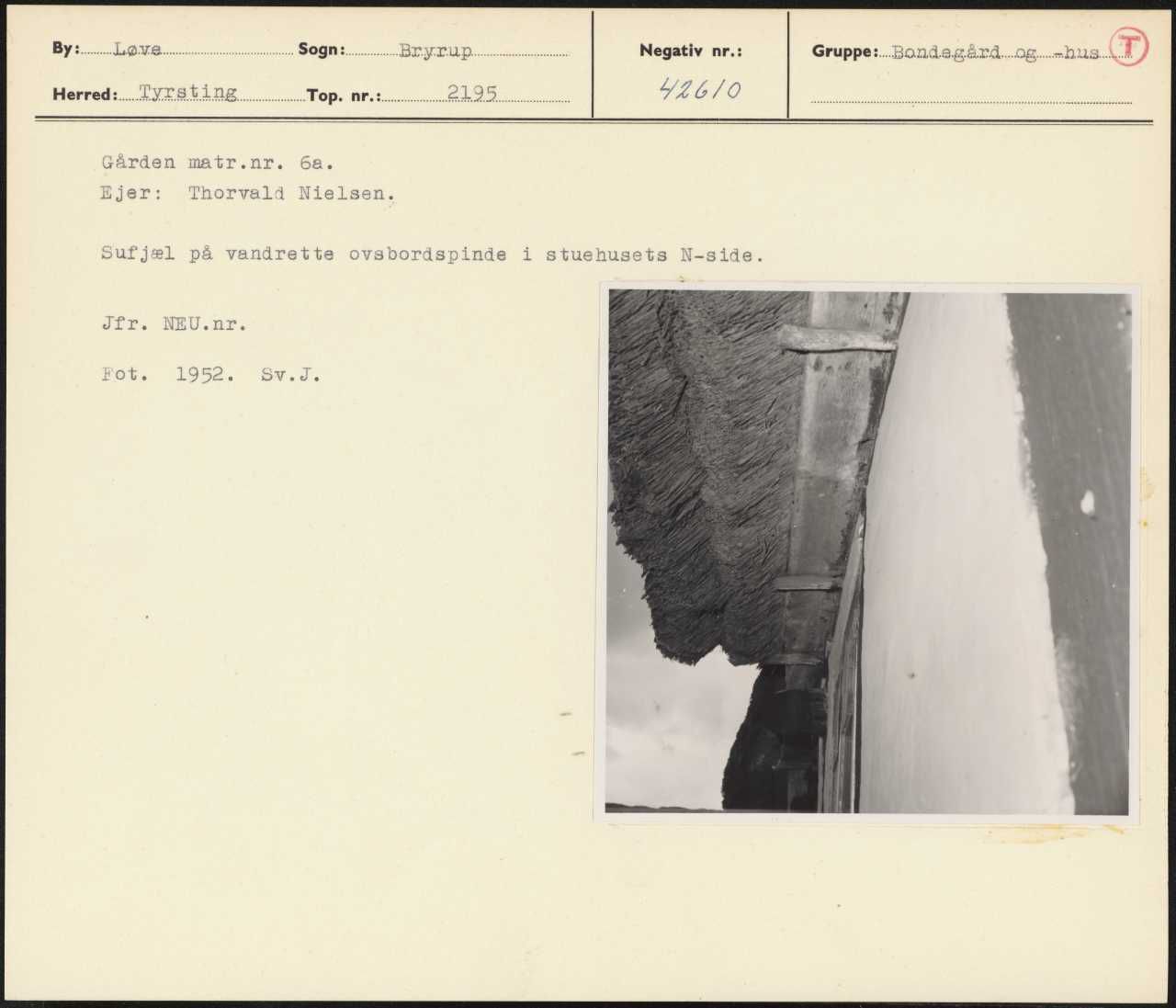 Maskingenkendt tekst fra arkivkort. Gården matr.nr. 6a. Ejer: Thorvald Nielsen. Sufjæl på vandrette ovsbordspinde i stuehusets N-side. Jfr. NEU.nr. nFot. 1952. BSv.J.