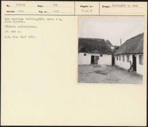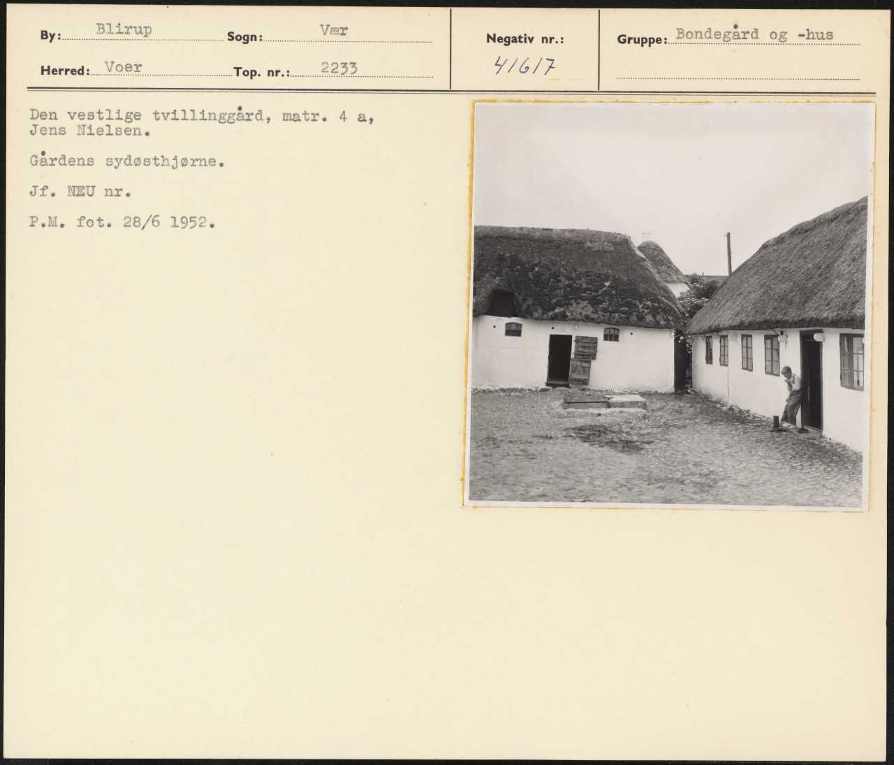 Maskingenkendt tekst fra arkivkort. Den vestlige tvillinggård, matr. 4 8, Jens Nielsen. Gårdens sydøsthjørne. Jf. NEU nr. P.M. fot. 28/6 1952.