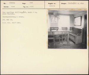 Maskingenkendt tekst fra arkivkort. Den vestlige tvillinggård, matr. 4 a, Jens Nielsen. Bordopstilling i stuen; Jf. NEU nr. P.M. fot. 28/6 1952.