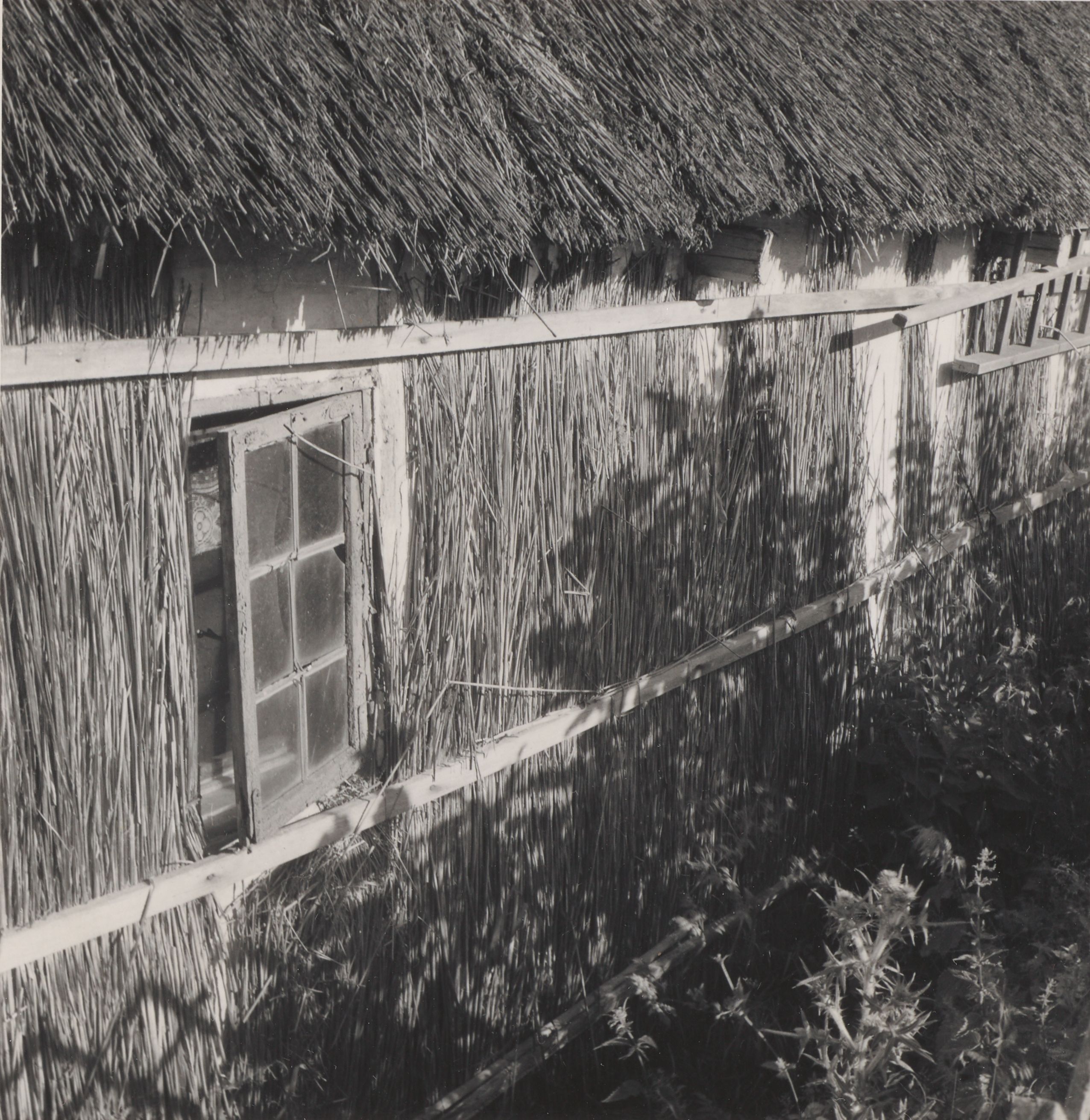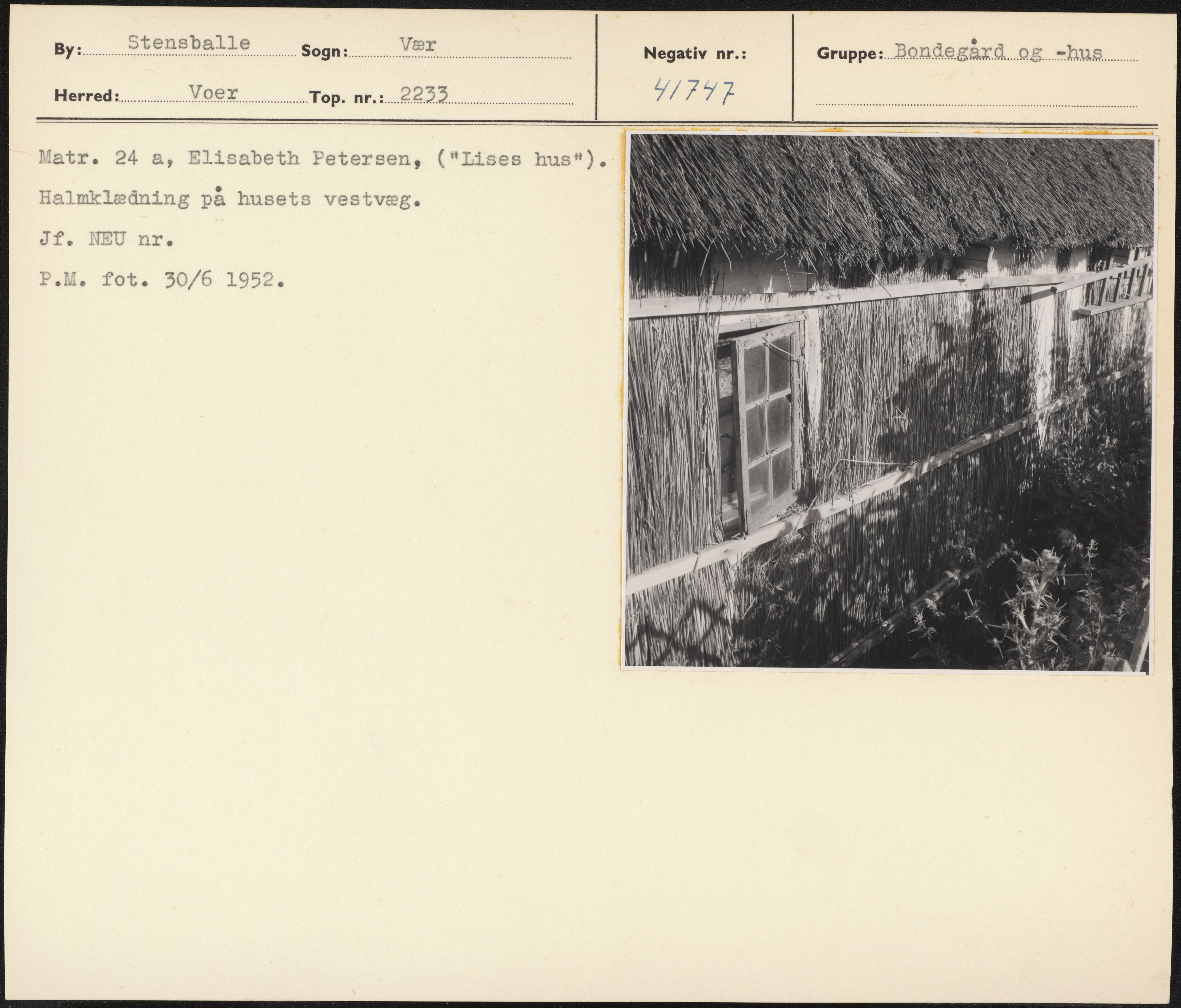 Maskingenkendt tekst fra arkivkort. Matr. 24 a, Elisabeth Petersen("Lises hus"). Halmklædning på husets vestvæg. Jf. NEU nr. P.M. fot. 30/6 1952.