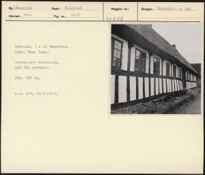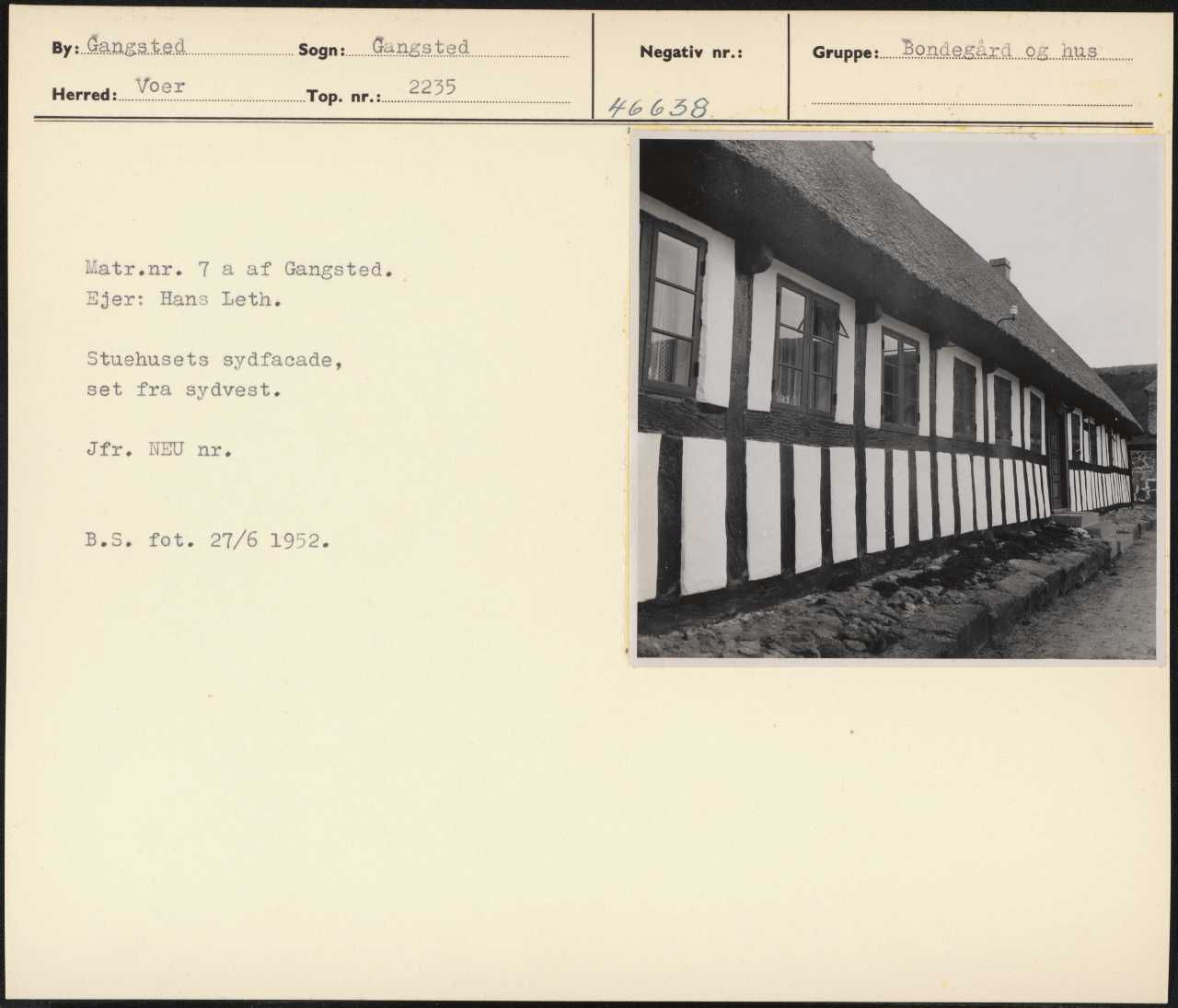 Maskingenkendt tekst fra arkivkort. Matr.nr. 7 a af Gangsted. Ejer: Hans Leth. Stuehusets sydfacade, set fra sydvest. Jfr. NEU nr. B.S. fot. 27/6 1952.