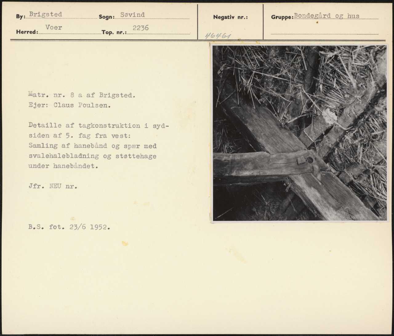 Maskingenkendt tekst fra arkivkort. Matr. nr. 8 a af Brigsted. nm Ejer: Claus Poulsen. Detaille af tagkonstruktion i syd- siden af 5. fag fra vest: Samling af hanebånd og spær med svalehalebladning og støttehage under hanebåndet. Jfr. NEU nr. B.S. fot. 23/6 1952.