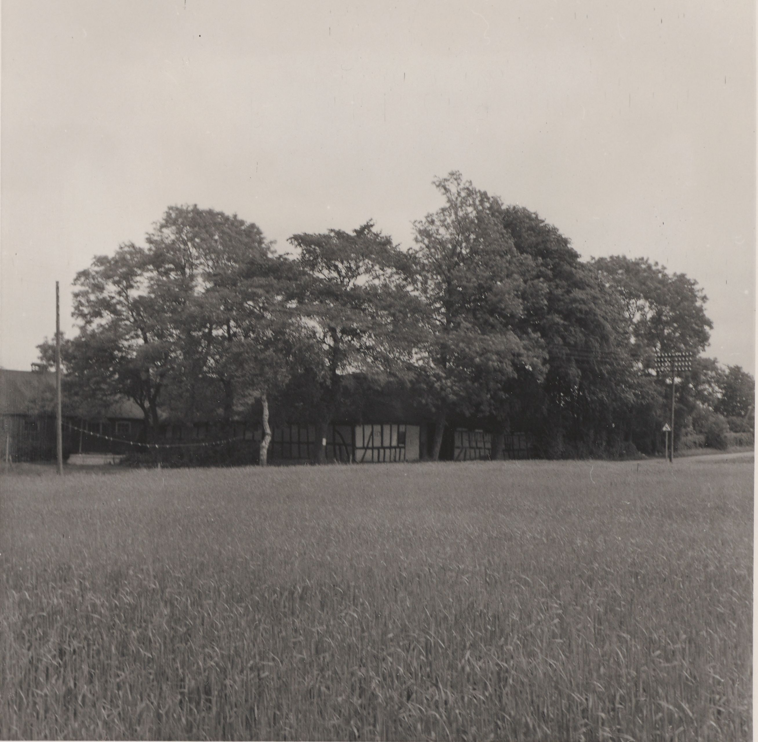 Maskingenkendt tekst fra arkivkort. Lille Kallhauge, matr. 11 e. 5 Ejer: J. Hauge. Gården set fra sydvest. Af de to bindings= værkslænger har den til venstre bjælker i slids, den til højre oplagte bjælker. P.M. fot. 27/6 1952.