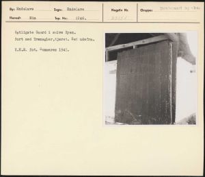 Maskingenkendt tekst fra arkivkort. stligste Gaard i selve Byen. Port med Trænagler,tjæret. Set udefra. H.H.E. fot. Sommeren 1943.