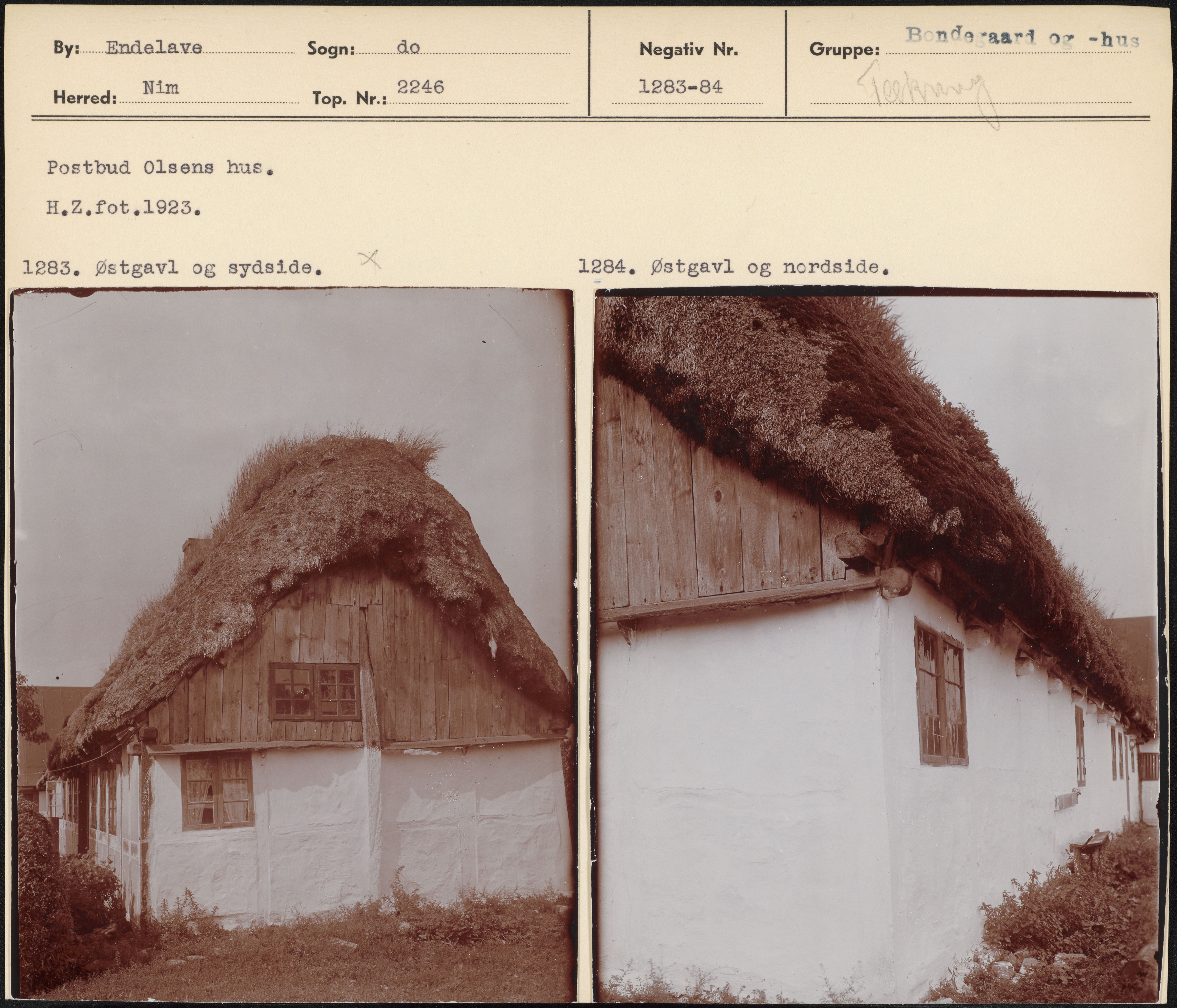 Maskingenkendt tekst fra arkivkort. Postbud Olsens hus, H.Z.fot 1923. 1283, Østgavl og sydside, X 1284. Østgavl og nordside,
