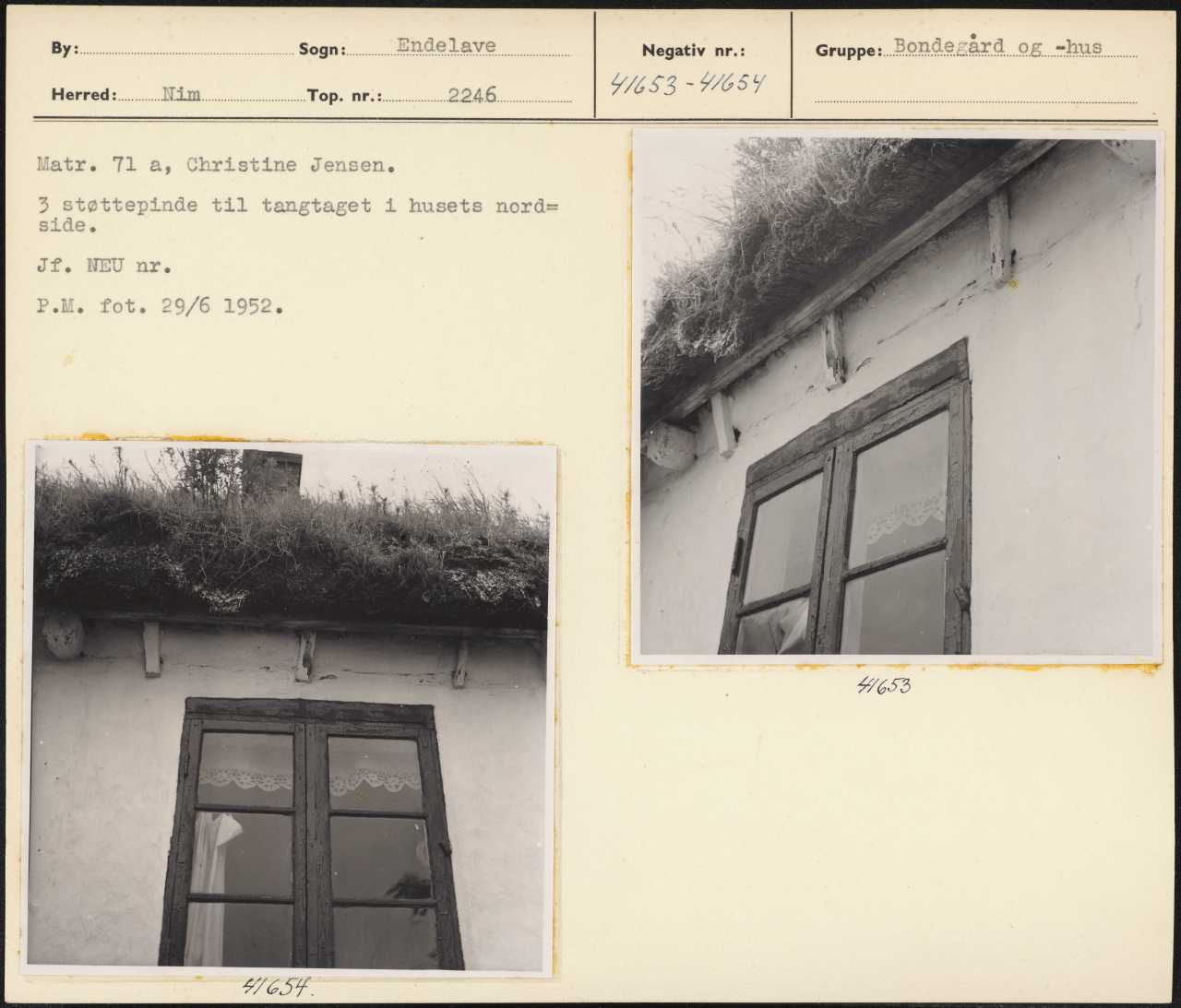 Maskingenkendt tekst fra arkivkort. Matr. 71 a, Christine Jensen. 3 støttepinde til tangtaget 1 husets noråd= side. Jf. NEU nr. P.M. fot. 29/6 1952. . HG53 : 7/ CIT.