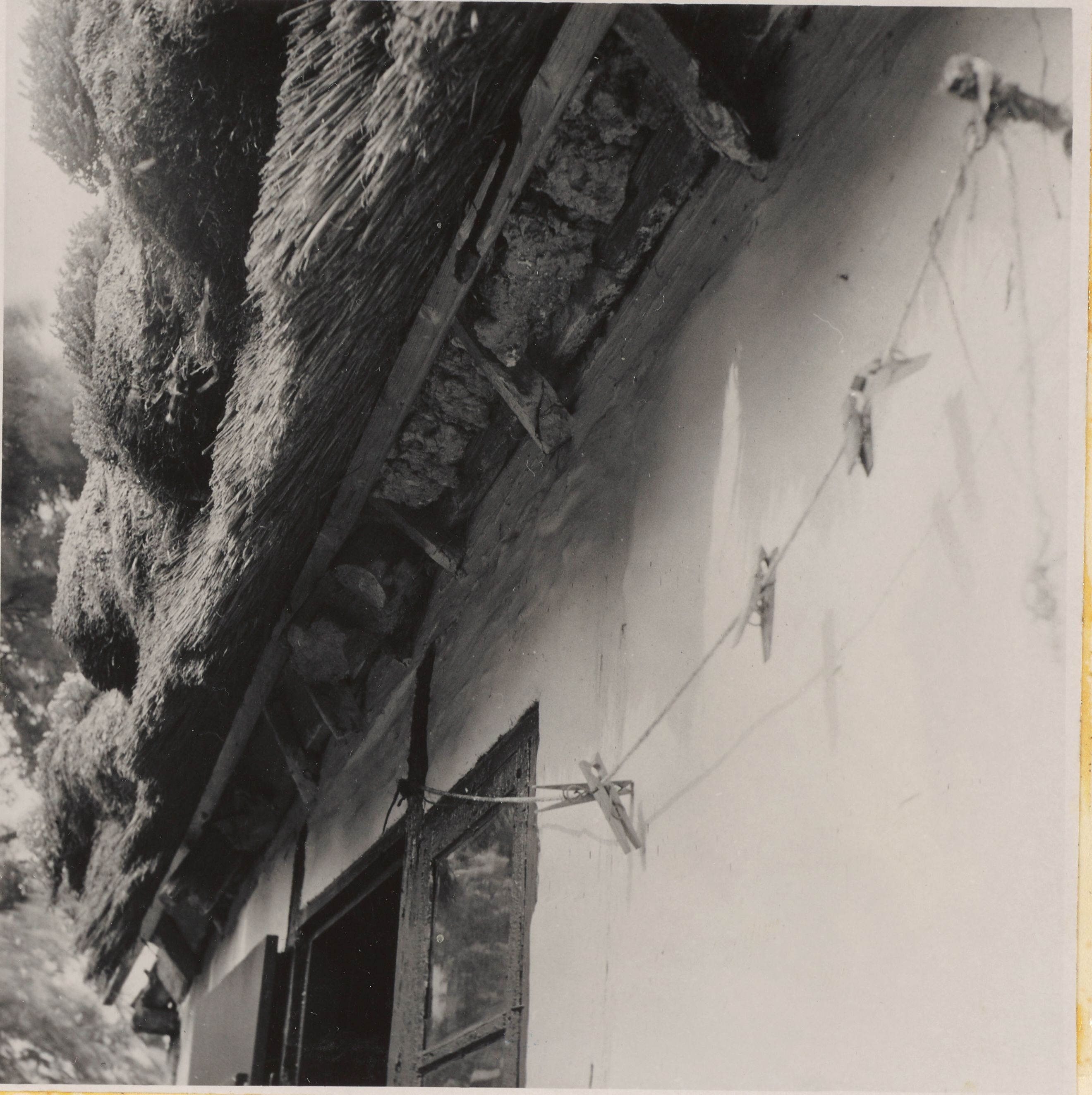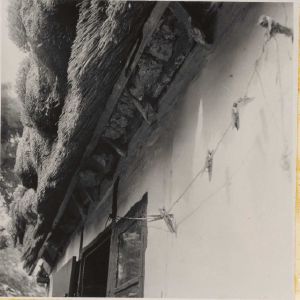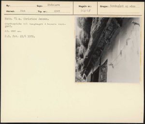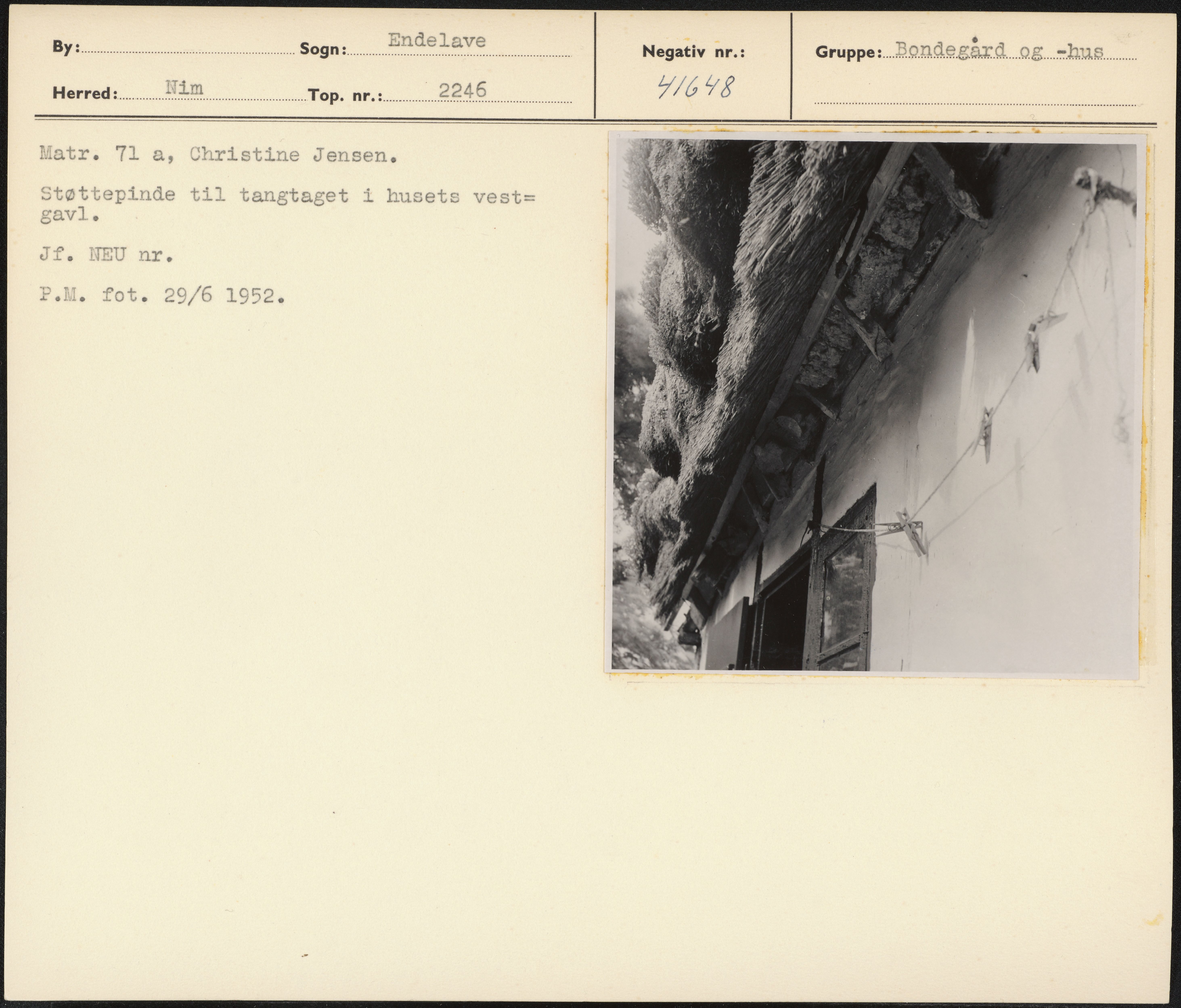 Maskingenkendt tekst fra arkivkort. Matr. 71 a, Christine Jensen, Støttepinde til tangtaget i husets vest= gavl. Jf. NEU nr. P.M. fot. 29/6 1952.