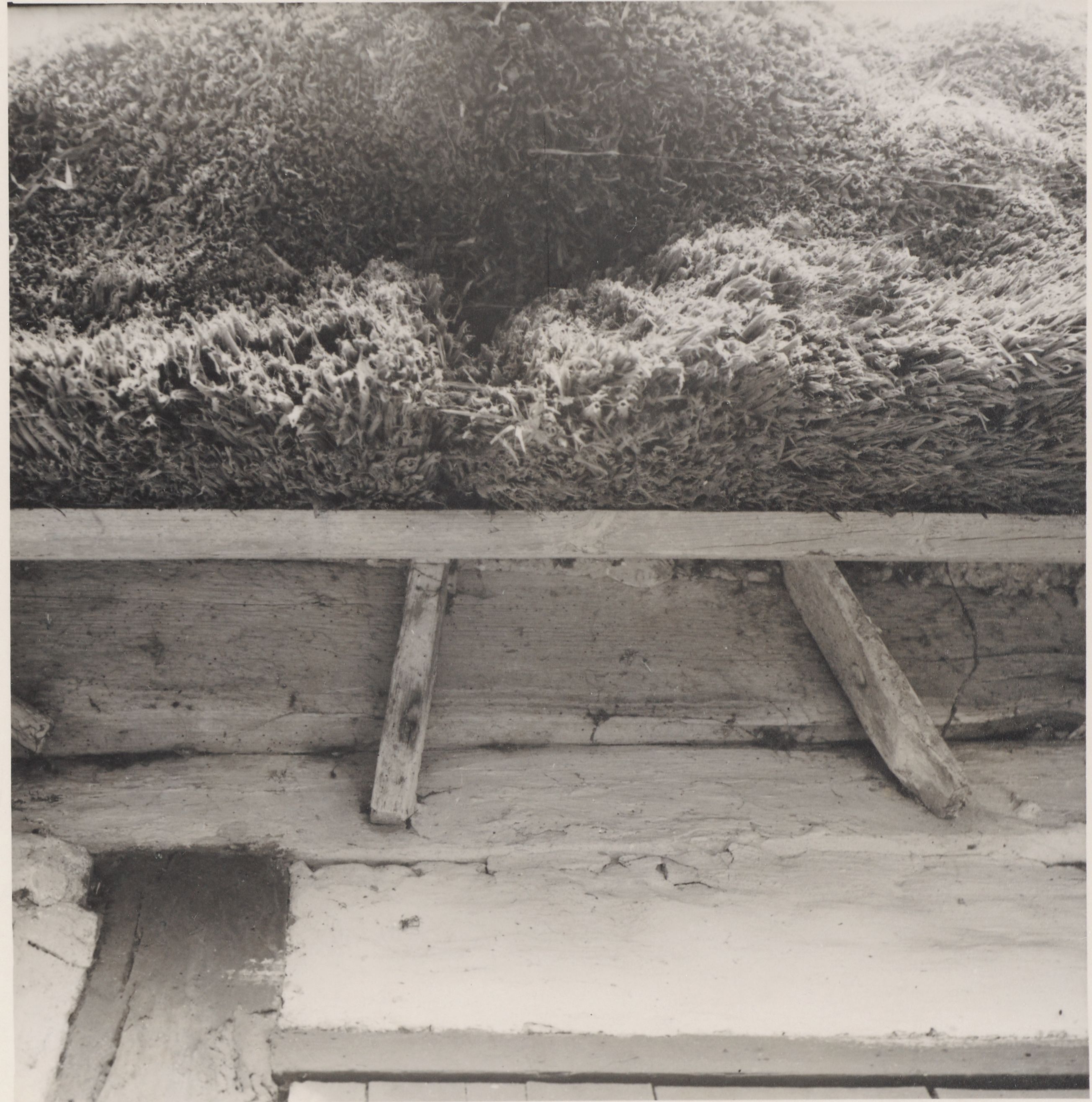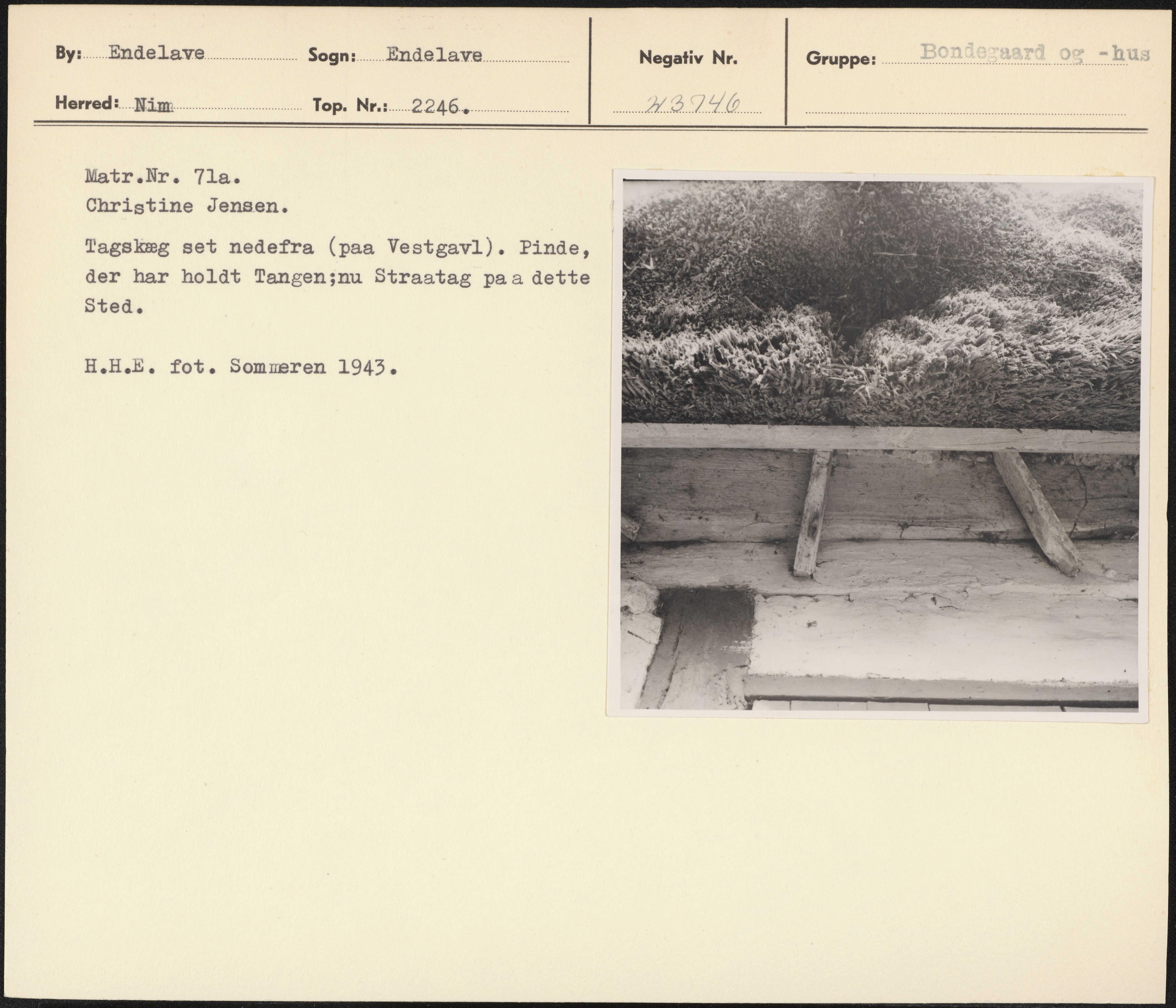 Maskingenkendt tekst fra arkivkort. Matr.Nr. 71a. Christine Jensen. Tagskæg set nedefra (paa Vestgavl). Pinde, der har holdt Tangeni;nu Straatag paa dette Sted. H.H.E. fot. Sommæren 1943.