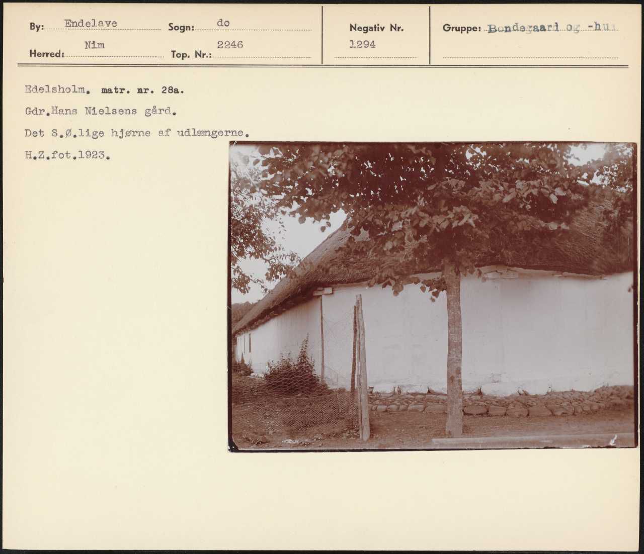 Maskingenkendt tekst fra arkivkort. Edelsholm, matr. nr. 28a. Gar,Hans Nielsens gård, Det S.Ø,1lige hjørne af udlængerne, H.Z.fot 1923.
