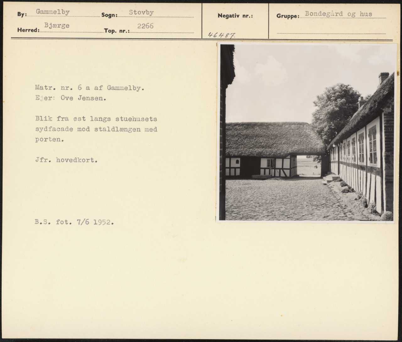 Maskingenkendt tekst fra arkivkort. k Matr. nr. 6 a af Gammelby. E'er: Ove Jensen. Blik fra øst langs stuehusets sydfacade mod staldlængen med porten. Jfr. hovedkort. B.S. fot. 7/6 1952.