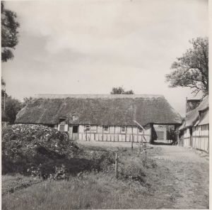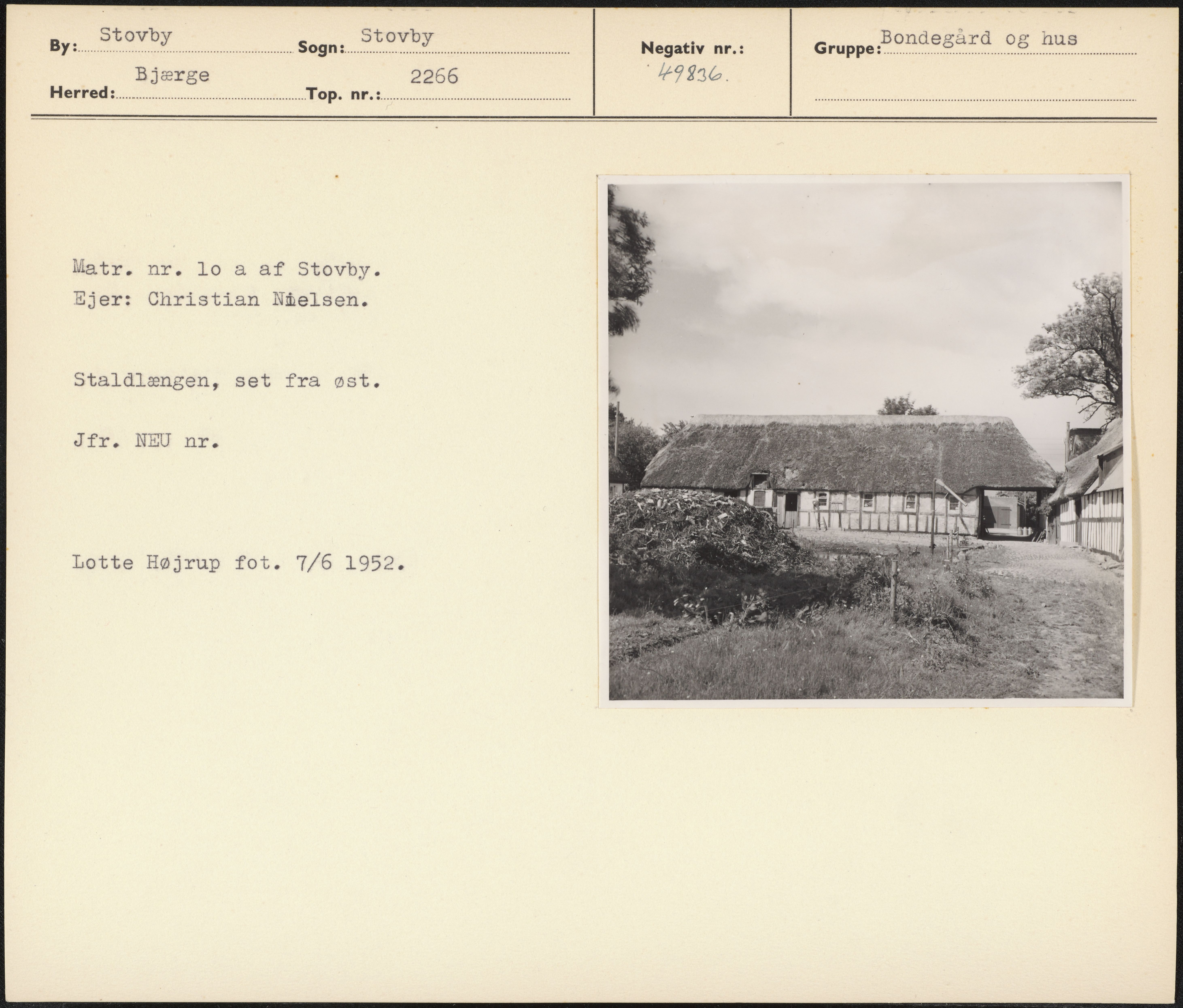 Maskingenkendt tekst fra arkivkort. Matr. nr. lo a af Stovby. Ejer: Christian Nielsen. Staldlængen, set fra øst. Jfr. NEU nr. Lotte Højrup fot. 7/6 1952.