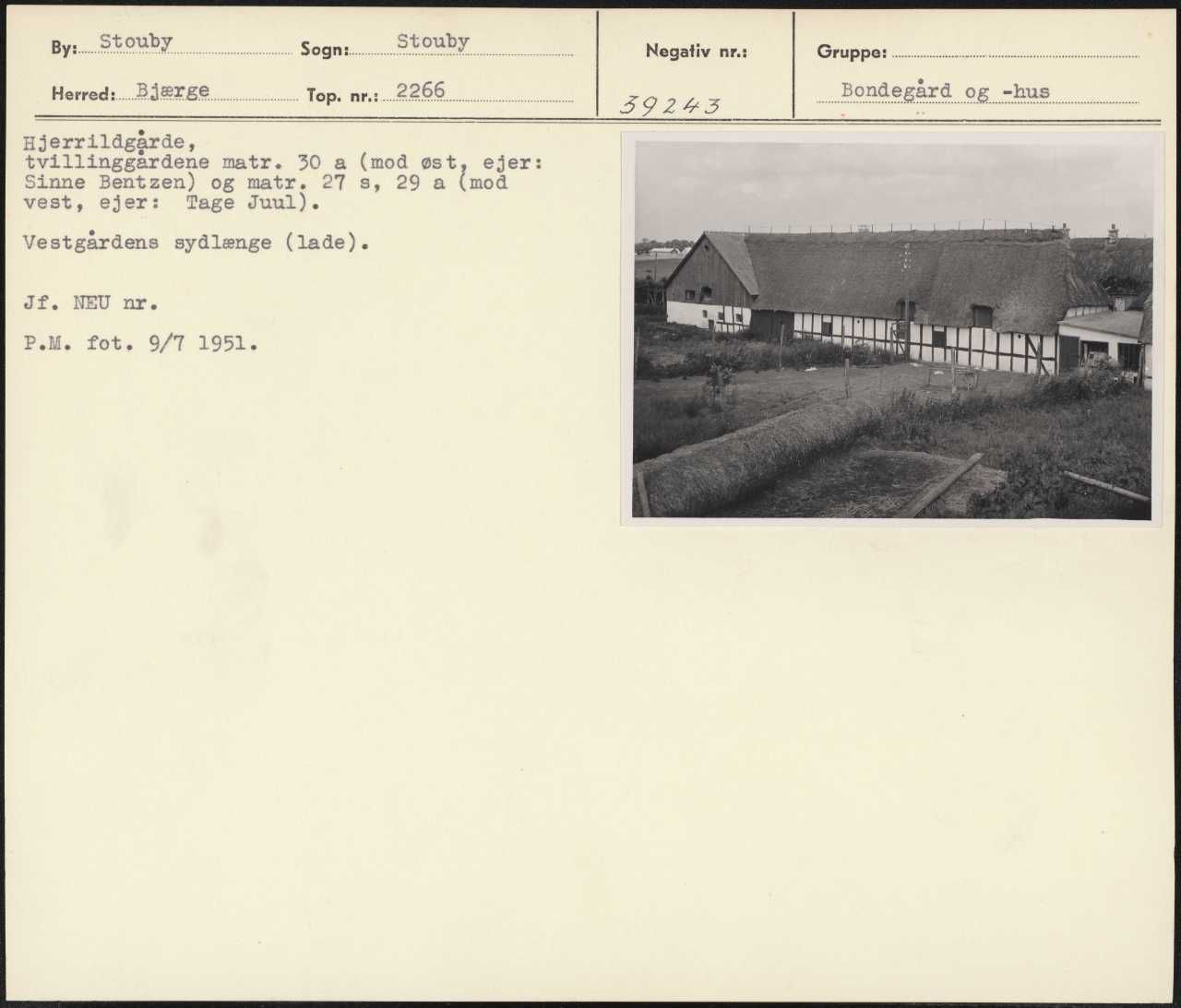 Maskingenkendt tekst fra arkivkort. Hjerrildgårde, tvillinggardene matr. 30 a (mod øst, ejer: Sinne Bentzen) og matr. 27 s, 29 a (mod vest, ejer: Tage Juul). Vestgårdens sydlænge (lade). Jf. NEU nr. P.M. fot. 9/7 1951.