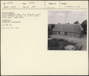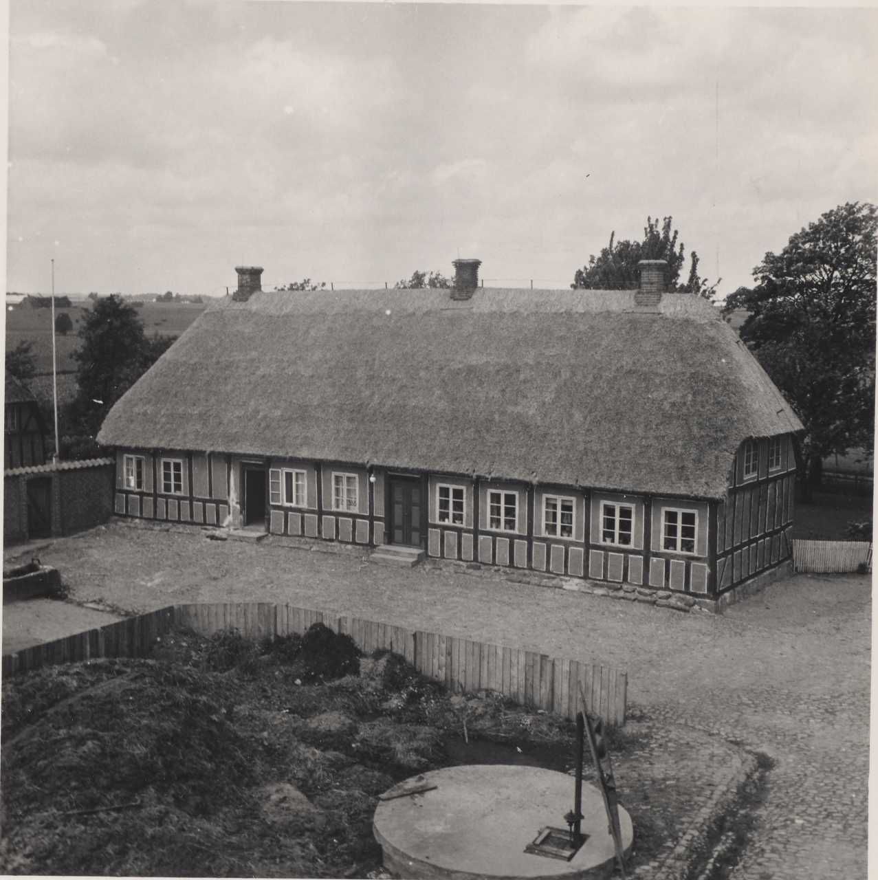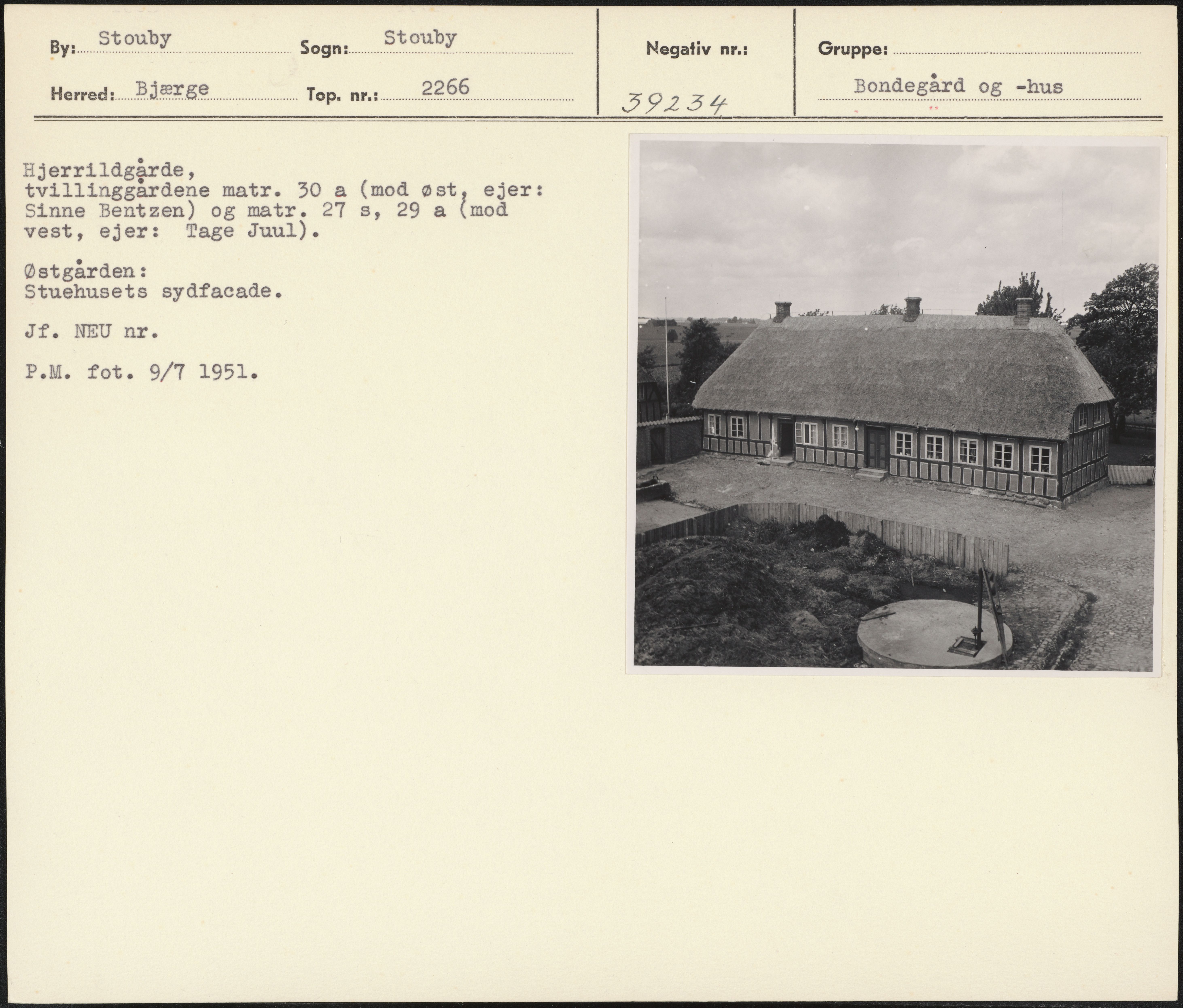 Maskingenkendt tekst fra arkivkort. Hjerrildgårde, tvillinggardene matr. 30 a (mod øst, ejer: Sinne Bentzen) og matr. 27 3, 29 a lmoå vest, ejer: Tage Juul). Østgården: Stuehusets sydfacade. Jf. NEU nr. P.M. fot. 9/7 1951.