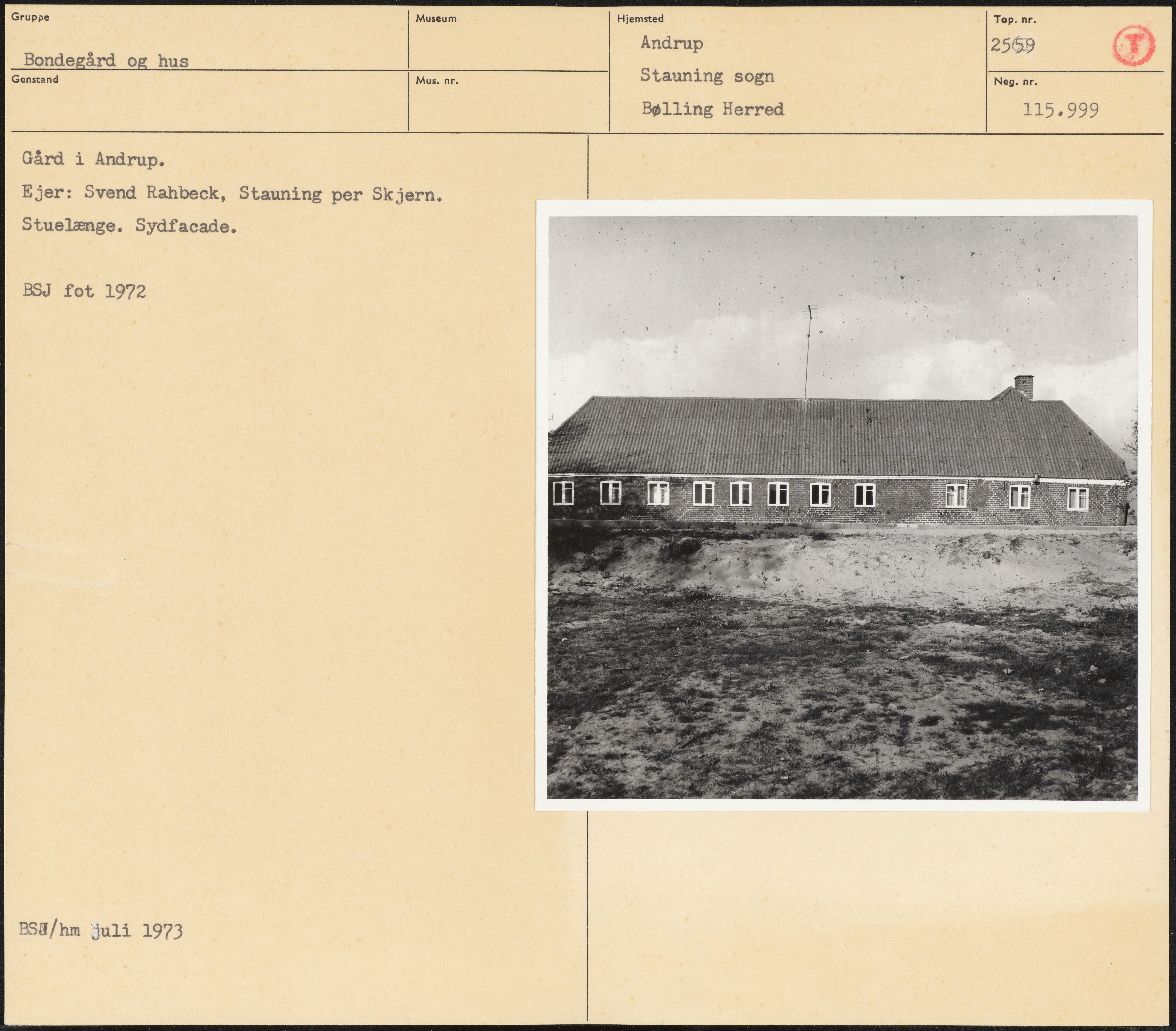 Maskingenkendt tekst fra arkivkort. Gård i Andrup. Ejer: Svend Rahbeck, Stauning per Skjern. Stuelænge. Sydfacade. BSJ fot 1972 BSH/hm 3juli 1973