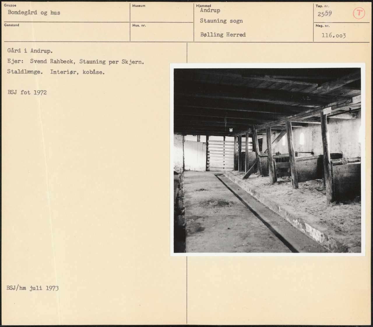 Maskingenkendt tekst fra arkivkort. Gård i Andrup. Ejer: Svend Rahbeck, Stauning per Skjern. Staldlænge. Interiør, kobåse. BSJ fot 1972 BSJ/hm juli 1973
