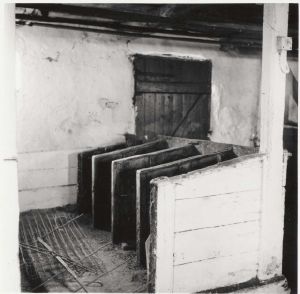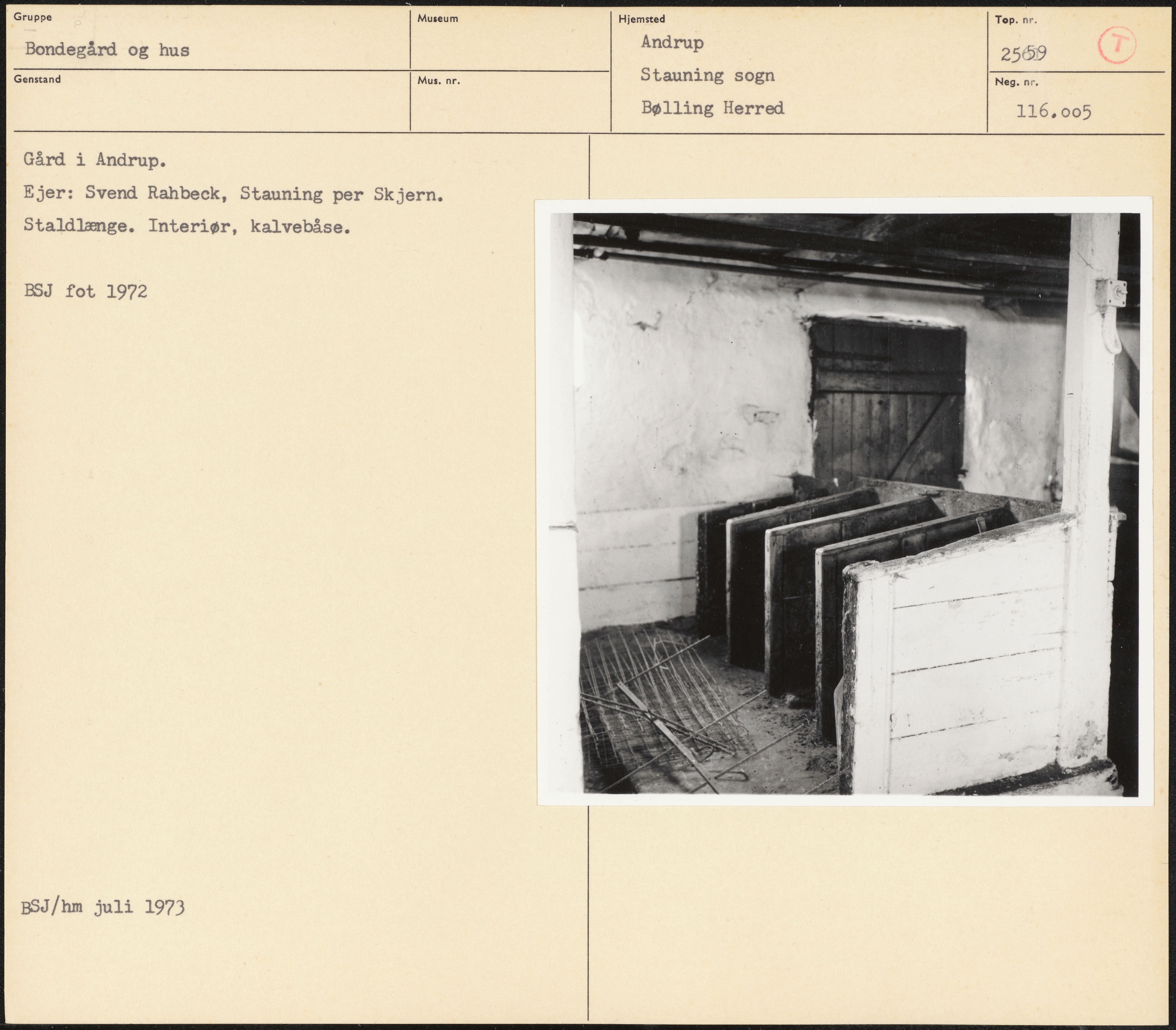 Maskingenkendt tekst fra arkivkort. Gård i Andrup. Ejer: Svend Rahbeck, Stauning per Skjern. Staldlænge. Interiør, kalvebåse. BSJ fot 1972 BSJ/hm juli 1973