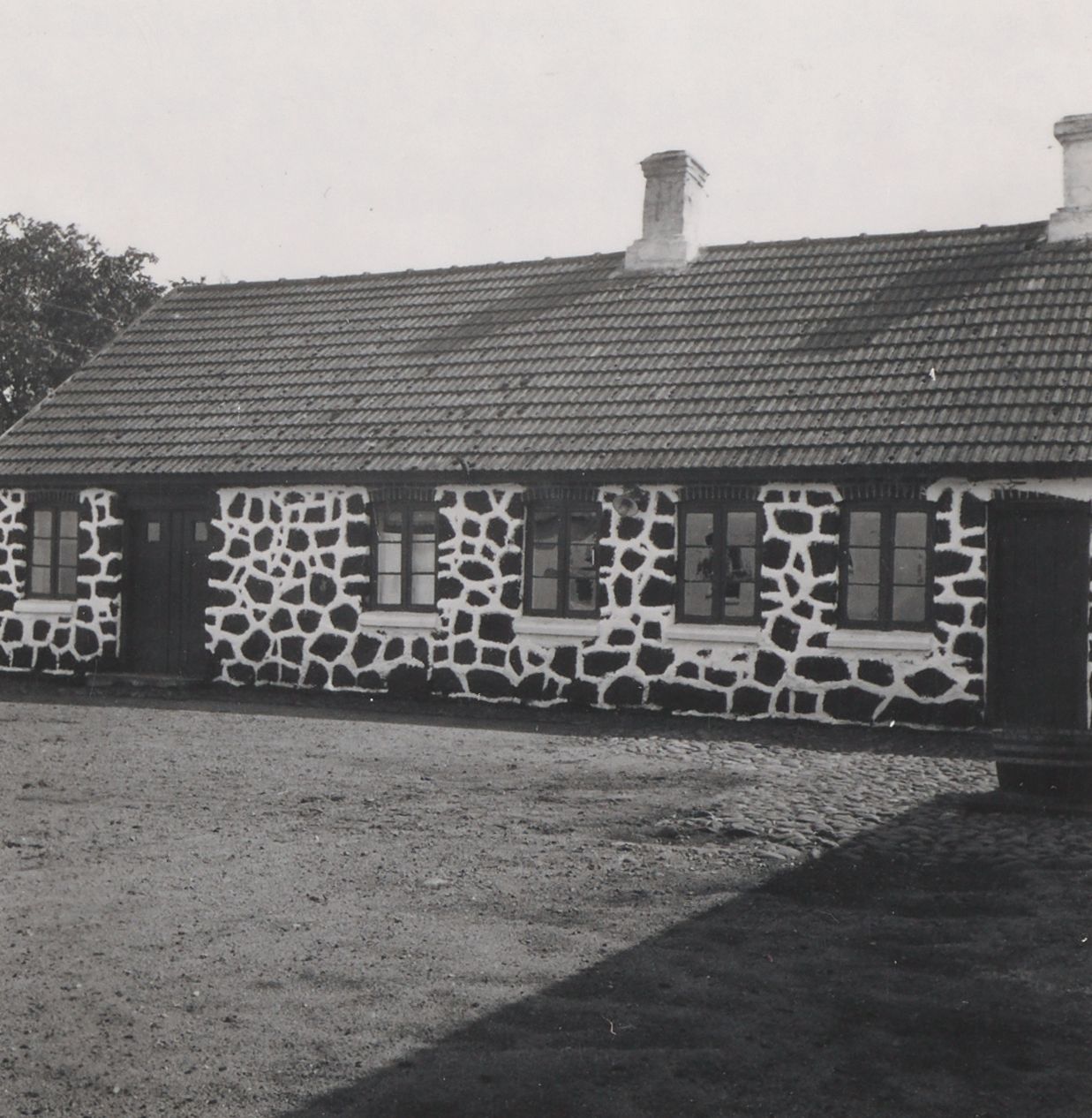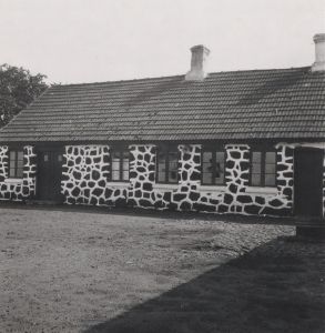 Maskingenkendt tekst fra arkivkort. Steensberg fot. 1942. Stuehus med Mur af Myrmalmblokke, Matr. Nr. 24 e. med fl. 5 Set fra Nord> I denne Side er Murtykkelsen r - 13” (=33 cm).