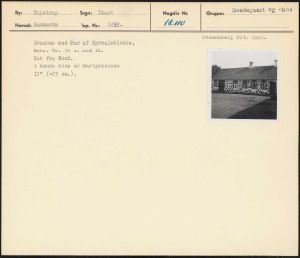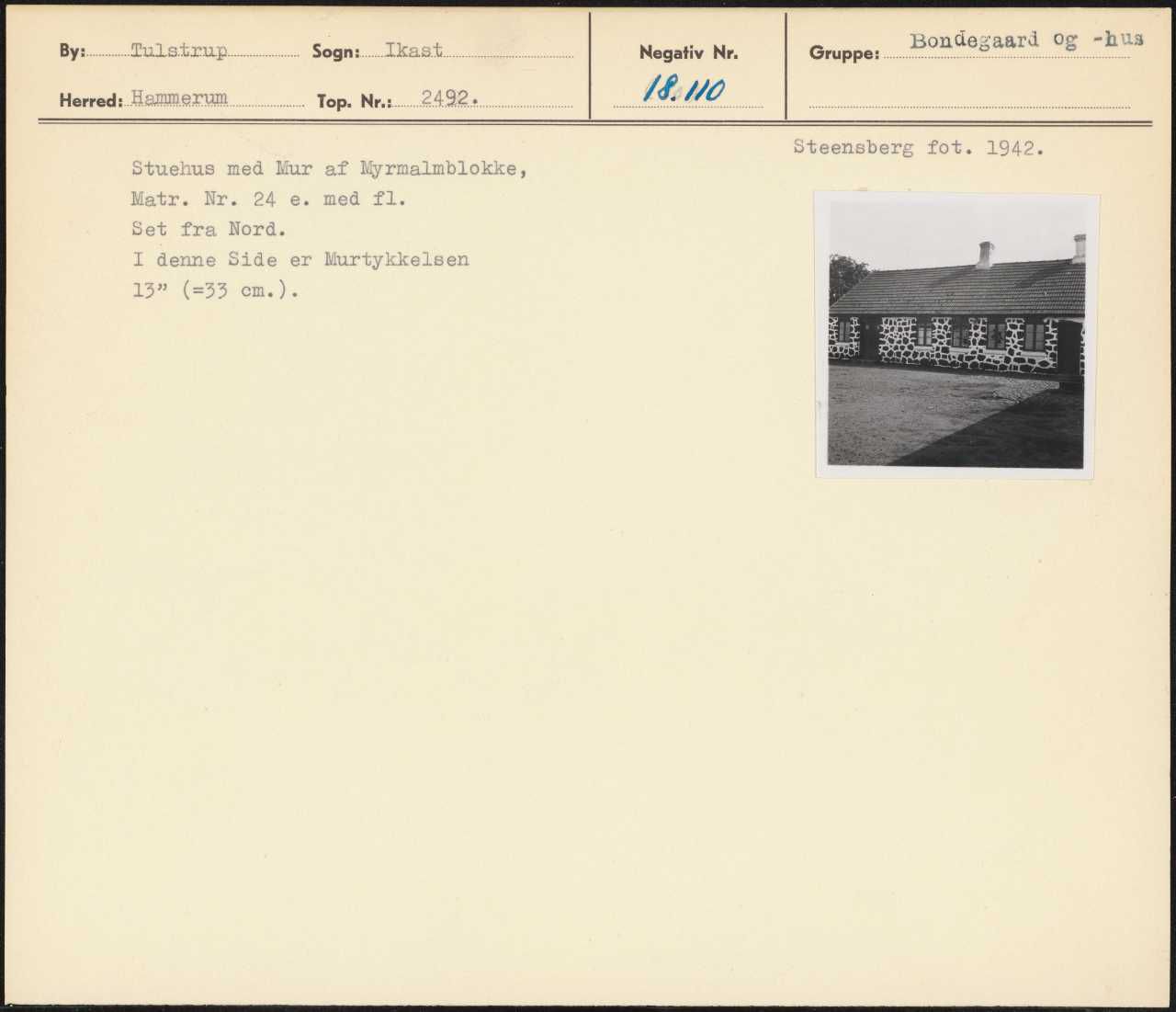 Maskingenkendt tekst fra arkivkort. Steensberg fot. 1942. Stuehus med Mur af Myrmalmblokke, Matr. Nr. 24 e. med fl. 5 Set fra Nord> I denne Side er Murtykkelsen r - 13” (=33 cm).