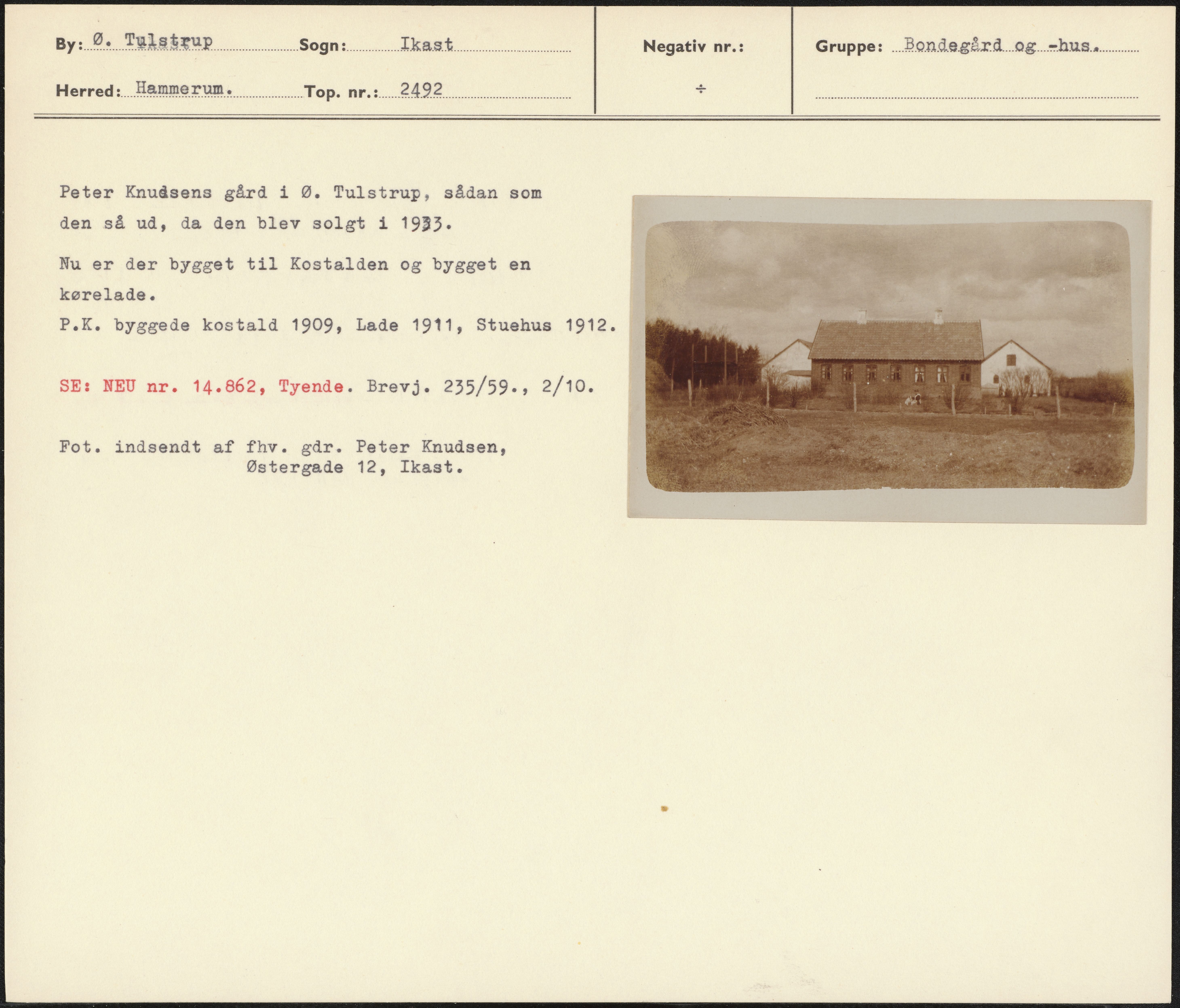 Maskingenkendt tekst fra arkivkort. Peter Knudsens gård i Ø. Tulstrup, sådan som den så ud, da den blev solgt i 1933. Nu er der bygget til Kostalden og bygget en kørelade. P.K. byggede kostald 1909, Lade 1911, Stuehus 1912. SE: NEU nr. 14.862, Tyende. Brevj. 235/59, 2/10. Fot. indsendt af fhv. går. Peter Knudsen, Østergade 12, Ikast.