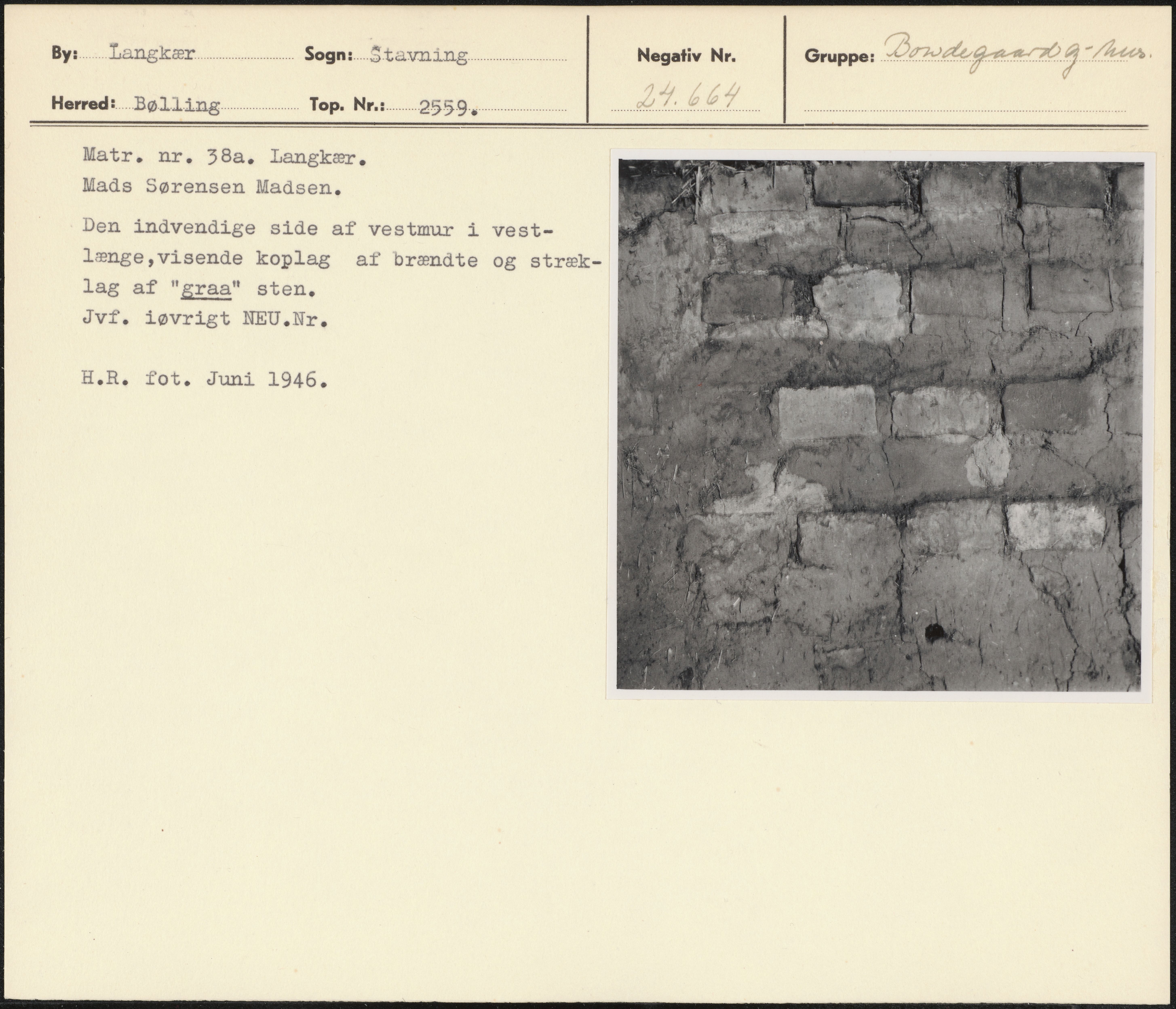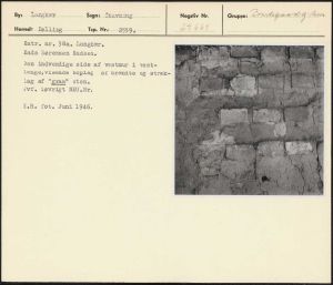 Maskingenkendt tekst fra arkivkort. Matr. nr. 38a. Langkær, Mads Sørensen Madsen, Den indvendige side af vestmur i vest- længe,visende koplag af brændte og stræk- lag af "graa" sten. Jvf. iøvrigt NEU.Nr. H.R. fot. Juni 1946.