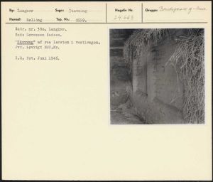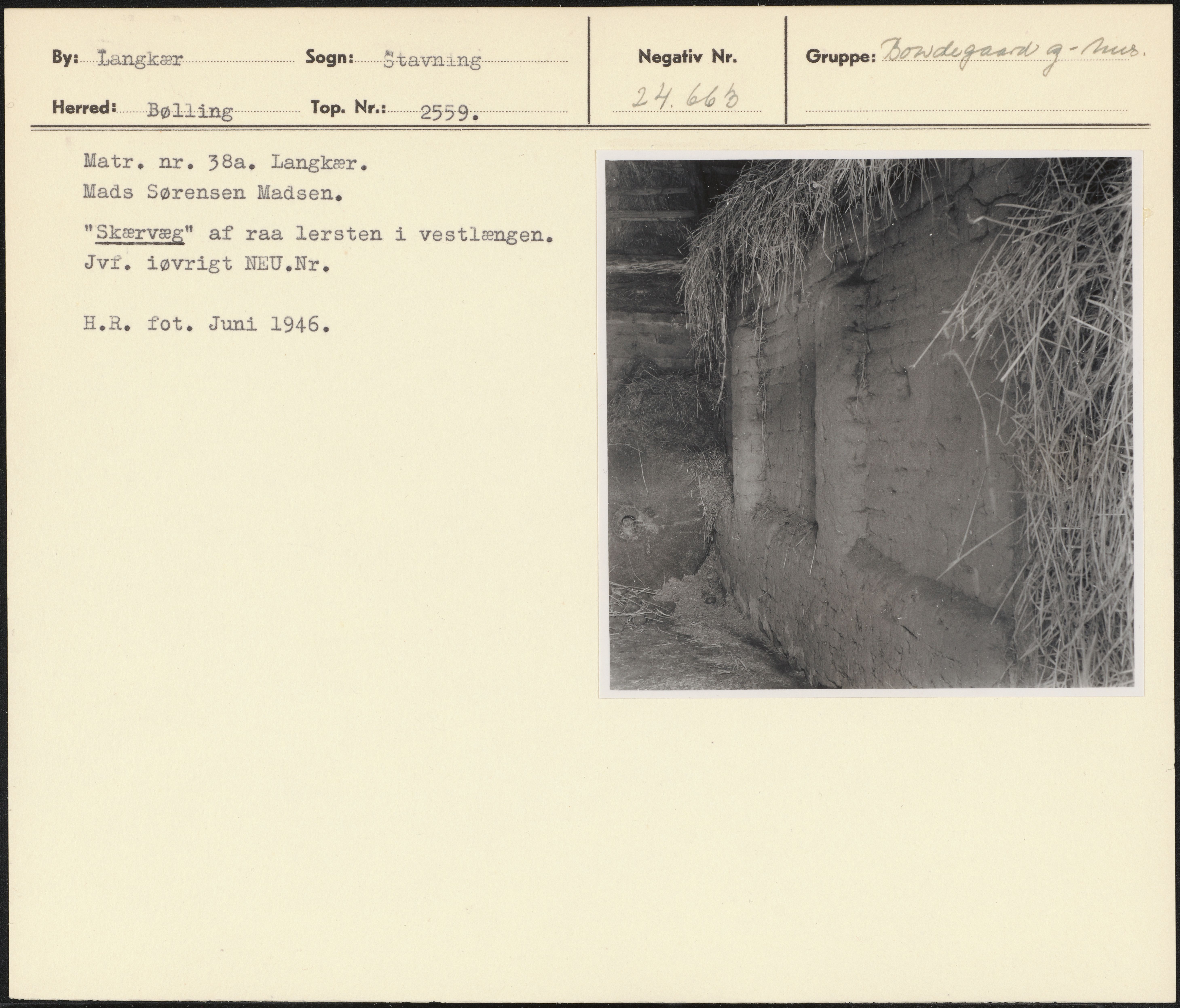 Maskingenkendt tekst fra arkivkort. Matr. nr. 38a, Langkær. Mads Sørensen Madsen, "Skærvæg" af raa lersten i vestlængen. Jvr. iøvrigt NEU.Nr. H.R. fot. Juni 1946,