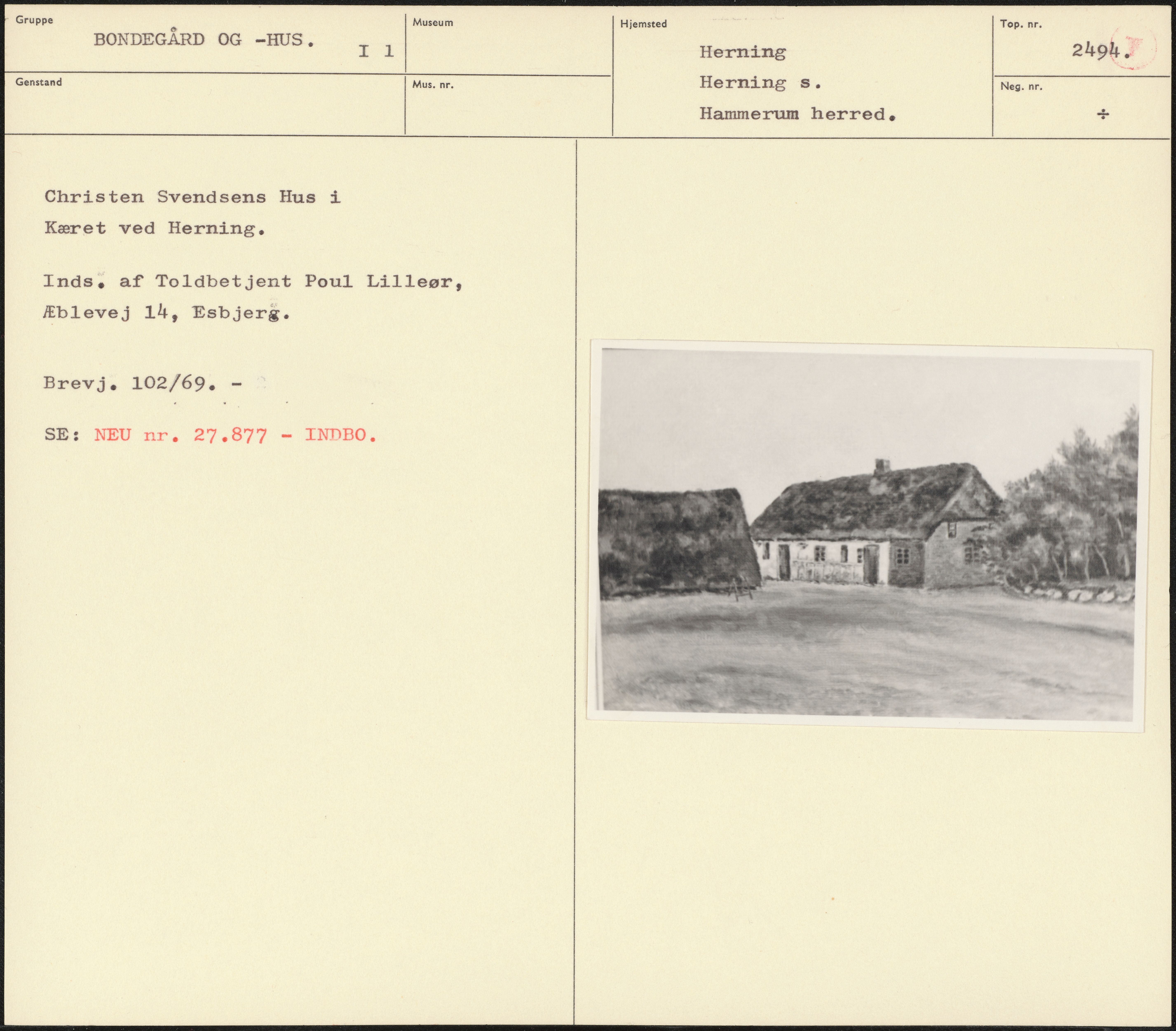 Maskingenkendt tekst fra arkivkort. Christen Svendsens Hus i Kæret ved Herning. Inds, af Toldbetjent Poul Lilleør, Æblevej 14, Esbjerg. Brevj. 102/69. —- SE: NEU nr. 27.877 - INDBO.