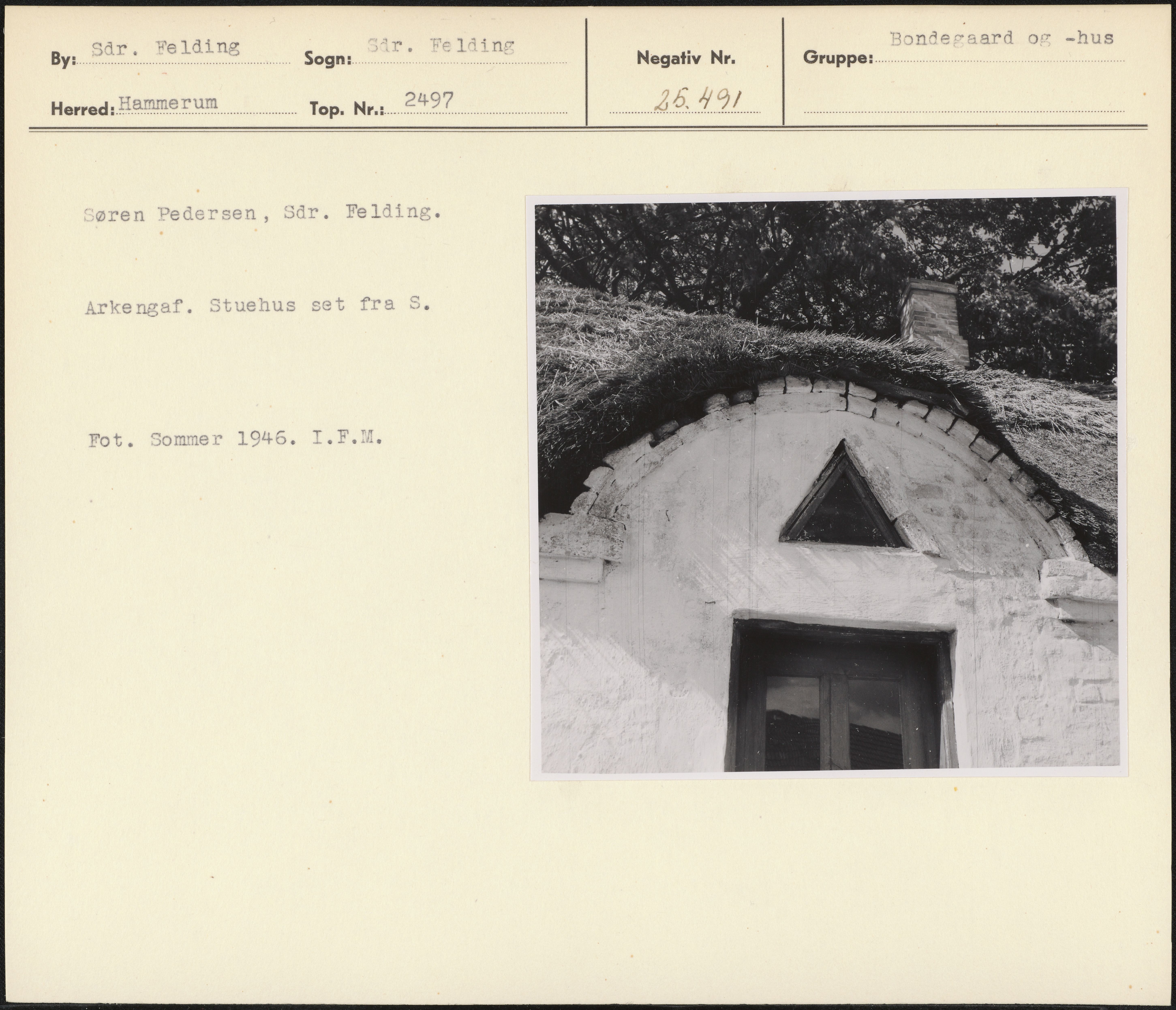 Maskingenkendt tekst fra arkivkort. Søren Pedersen, Sår. Felding. Arkengaf. Stuehus set fra S. Fot. Sommer 1946. I.F.M.