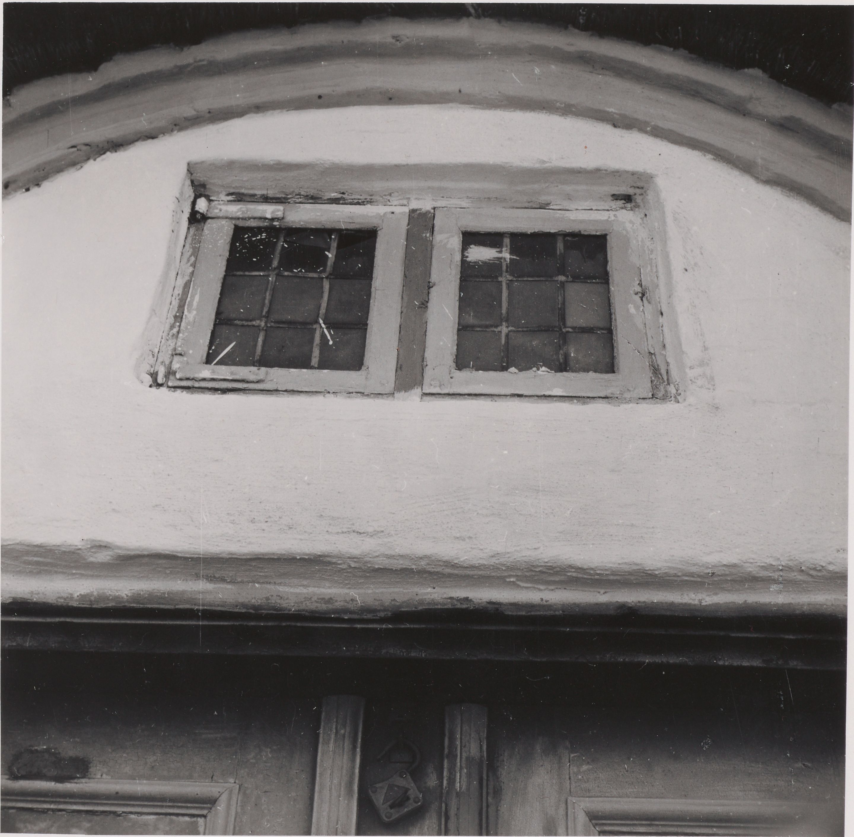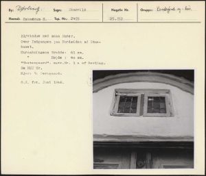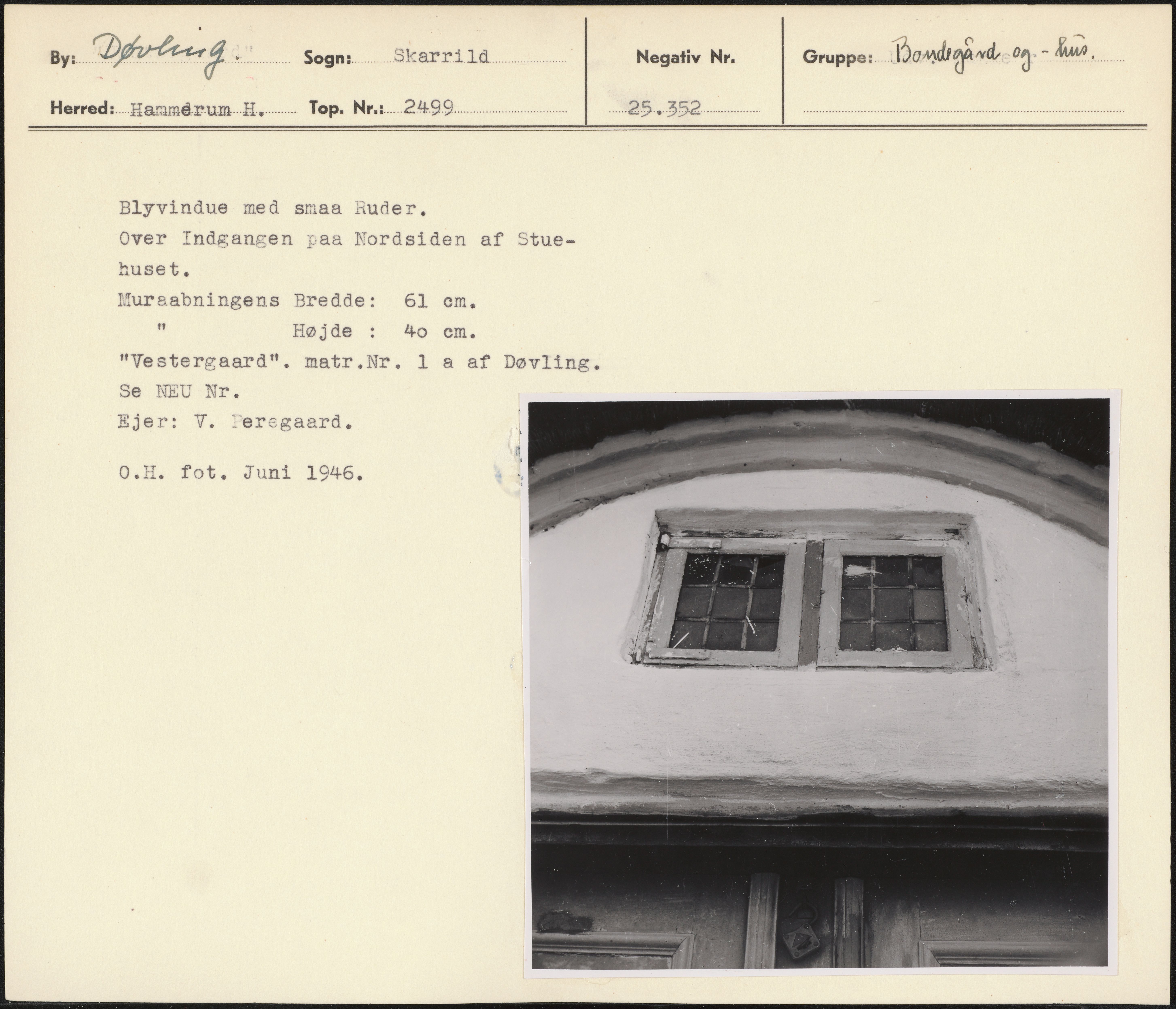 Maskingenkendt tekst fra arkivkort. Blyvindue med smaa Ruder, nm Over Indgangen paa Nordsiden af Stue- huset. Mursabningens Bredde: 61 cm. " Højde : 4&4o em. "Vestergaard". matr.Nr. 1 a af Døvling. Se NEU Nr. Ejer: V. Jeregaard. 0.H. fot. Juni 1946, 4