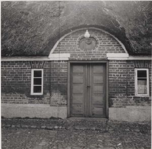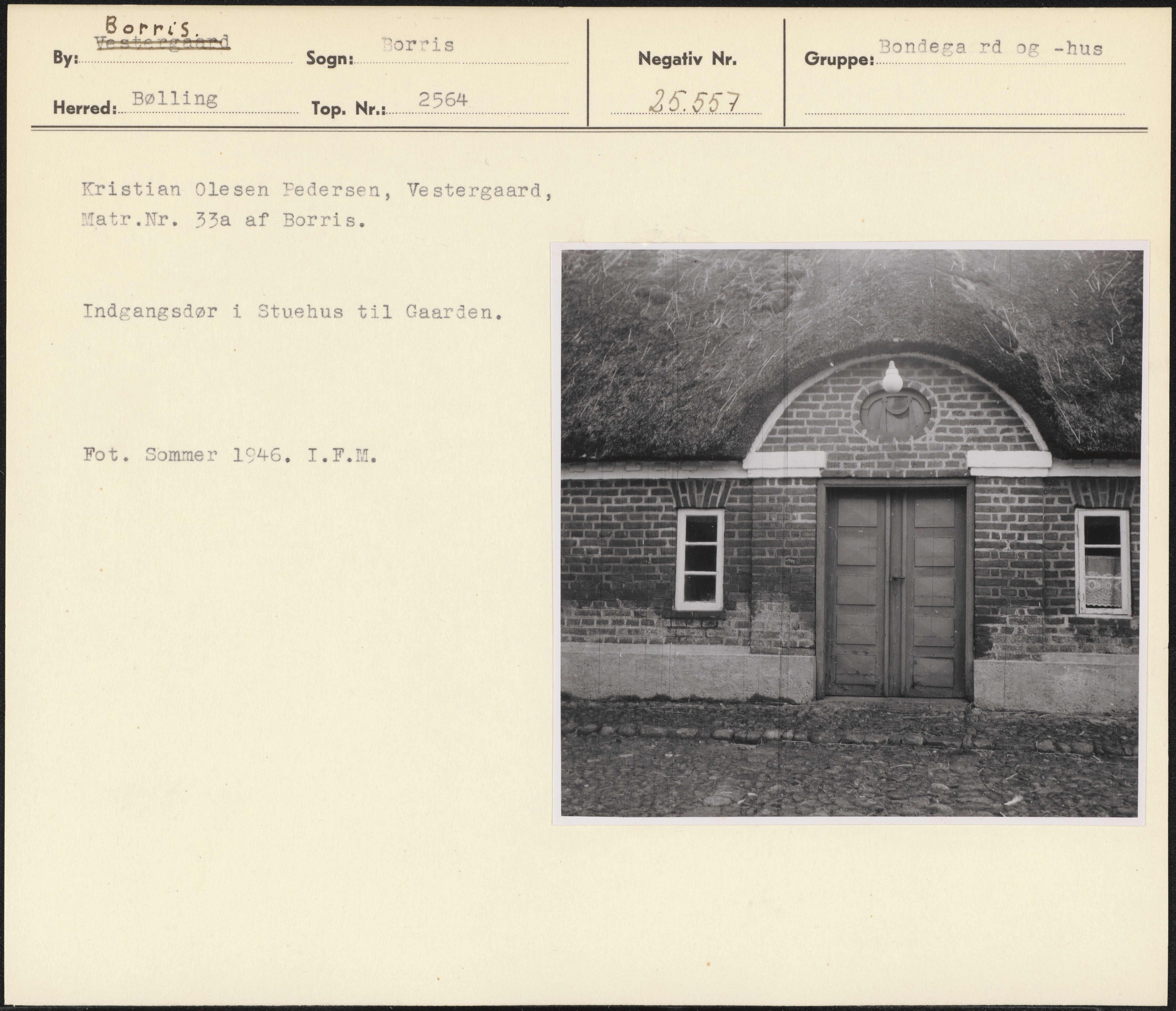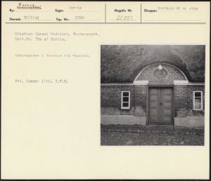 Maskingenkendt tekst fra arkivkort. nm Kristian Olesen Tedersen, Vestergaard, Matr.Nr. 35a af Borris, Indgangsdør i Stuehus til Caarden, Fot. Sommer 1946. I.F.M.