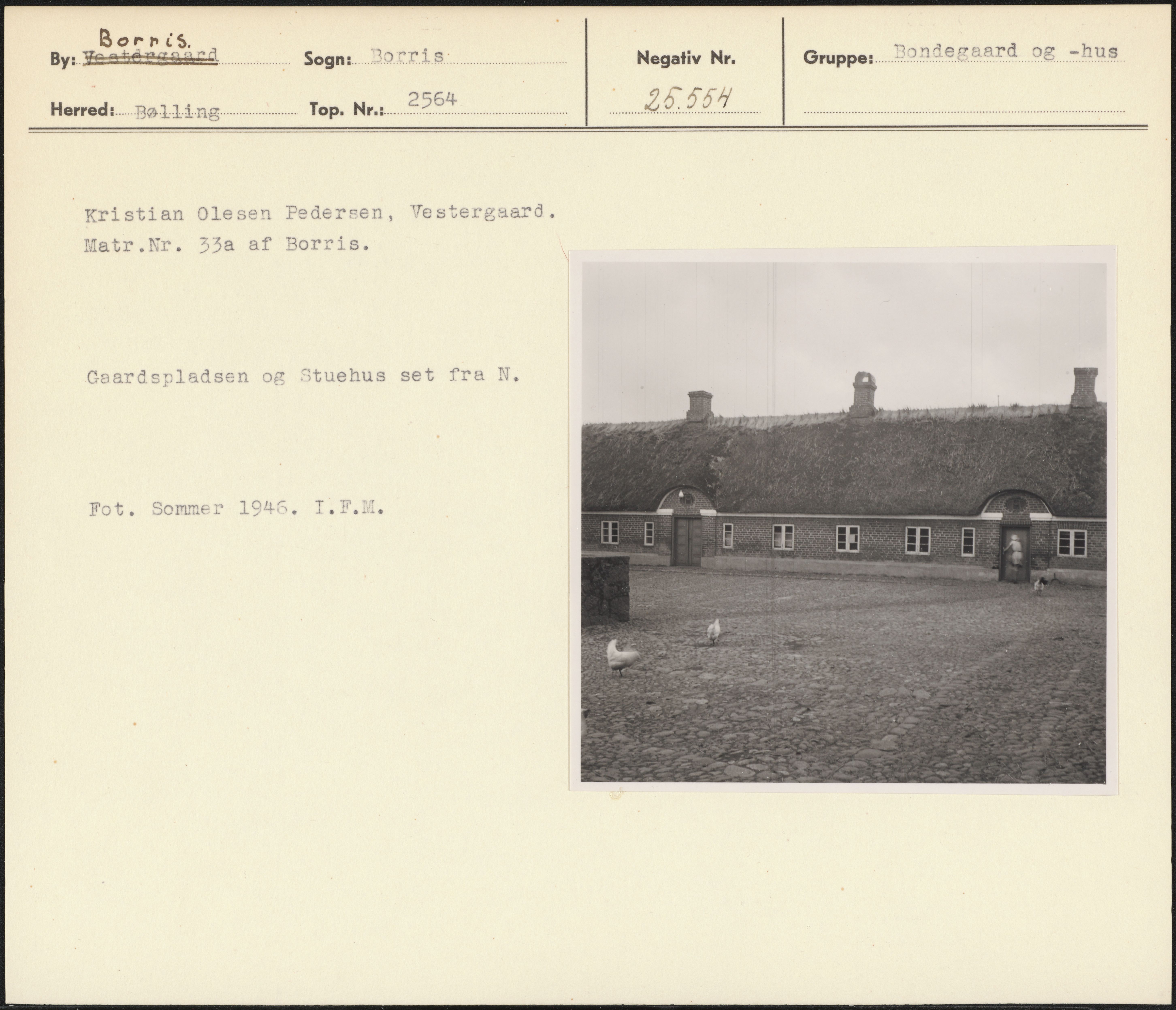 Maskingenkendt tekst fra arkivkort. Kristian Olesen Pedersen, Vestergaard. Matr.Nr. 33a af Borris. Csardspladsen og Stuehus set fra N. Fot. Sommer 1946. I.F.M.