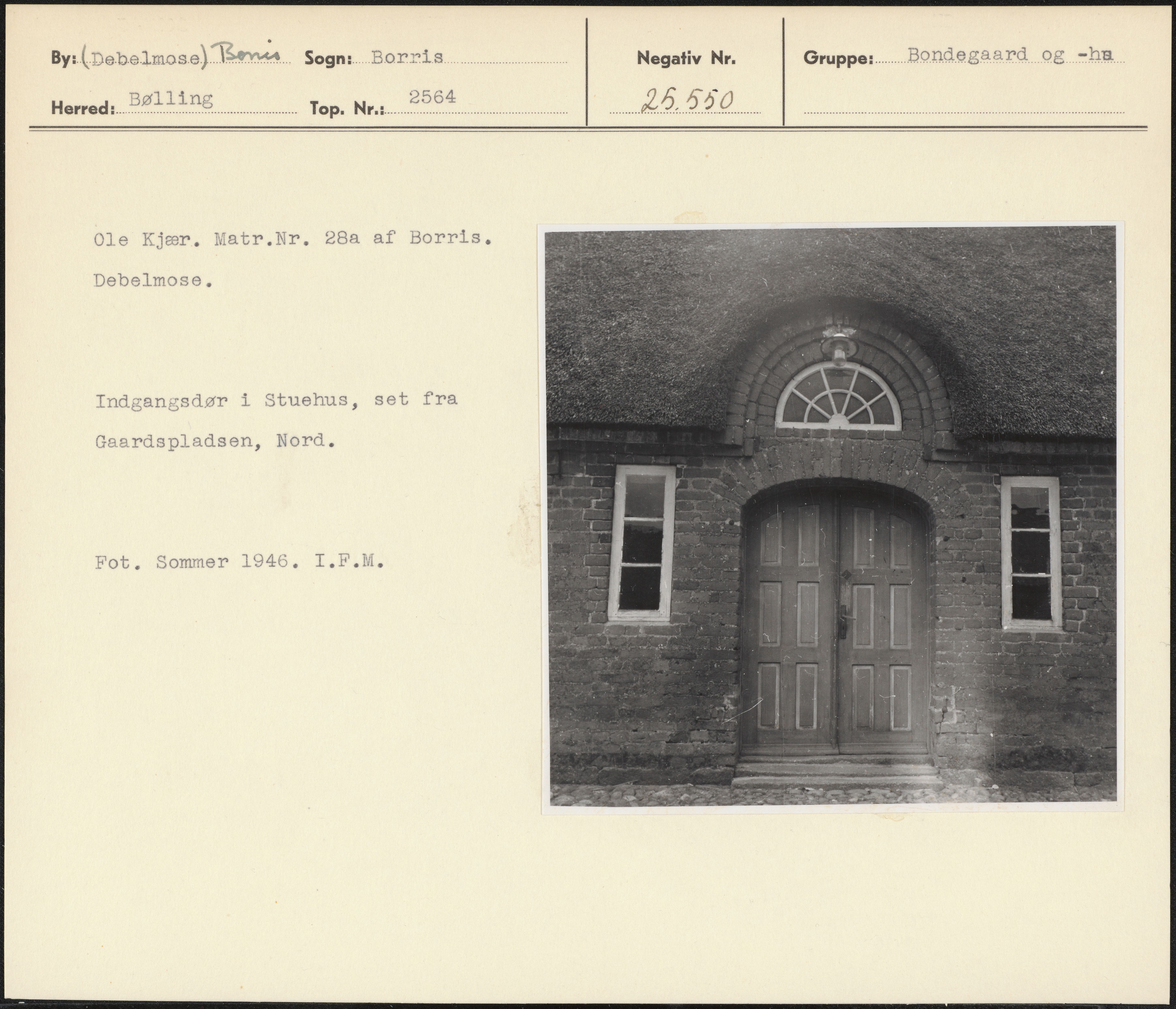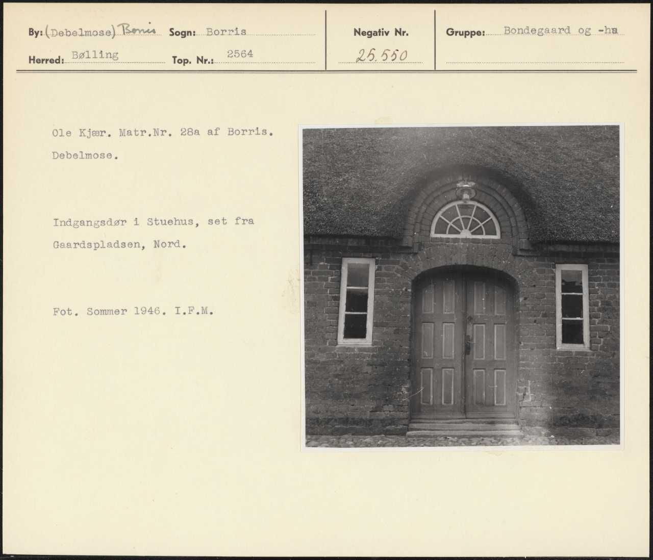Maskingenkendt tekst fra arkivkort. Ole Kjær. Matr.Nr, 28a af Borris. Debelmose. Indgangsdør i Stuehus, set fra Gaardspladsen, Nord. Fot, Sommer 1946. I.F.M.