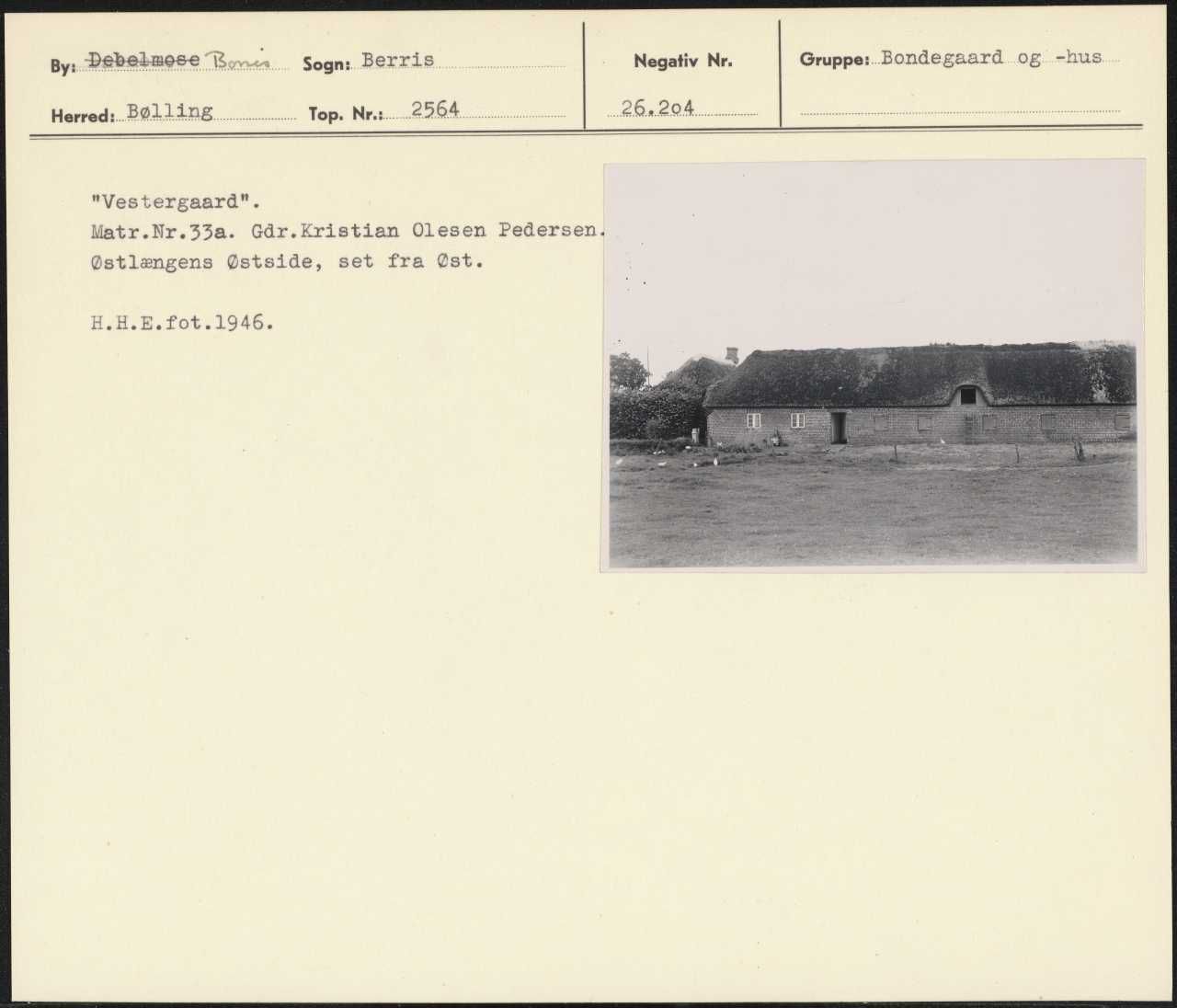 Maskingenkendt tekst fra arkivkort. Vestergaard". Matr.Nr.33a. Gdr.Kristian Olesen Pedersen nm Østlængens Østside, set fra Øst. H.H.E.fot.1946.