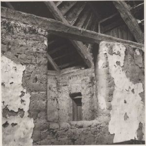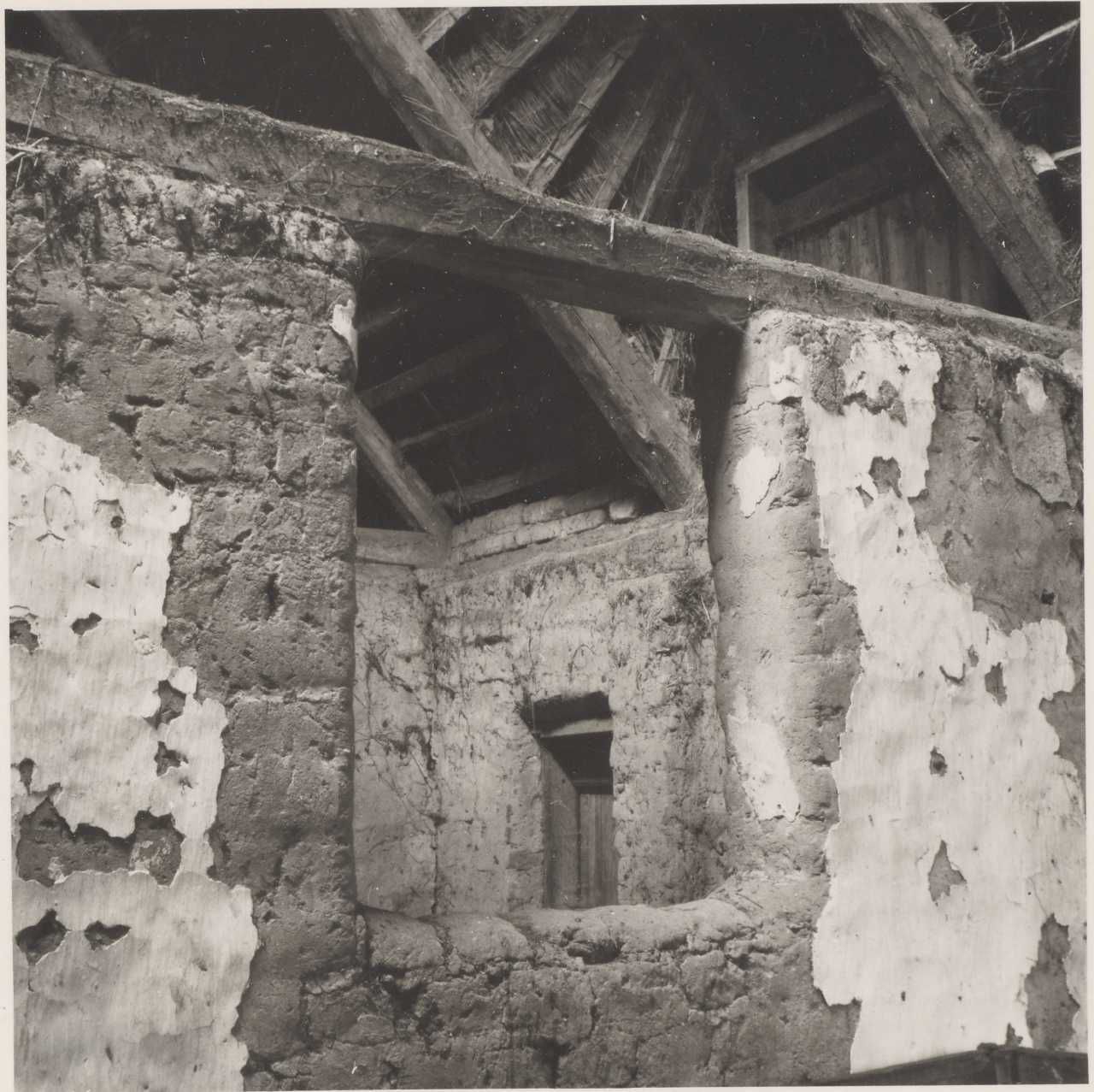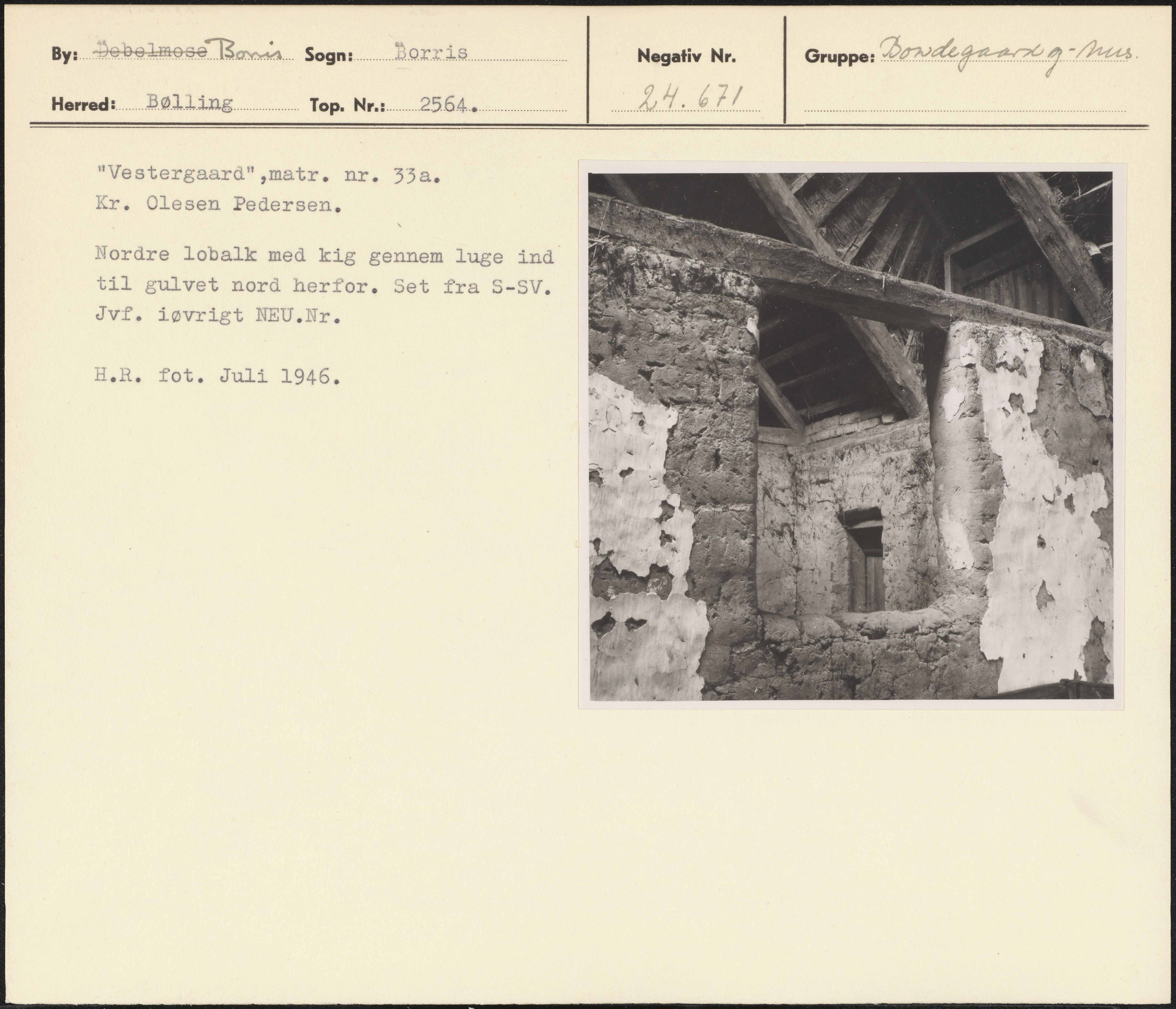 Maskingenkendt tekst fra arkivkort. Vestergaard",matr. nr. 33a, Kr. Olesen Pedersen, Nordre lobalk med kig gennem luge ind til gulvet nord herfor. Set fra S-SV. Jvf. iøvrigt NEU.Nr. H.R. fot. Juli 1946.