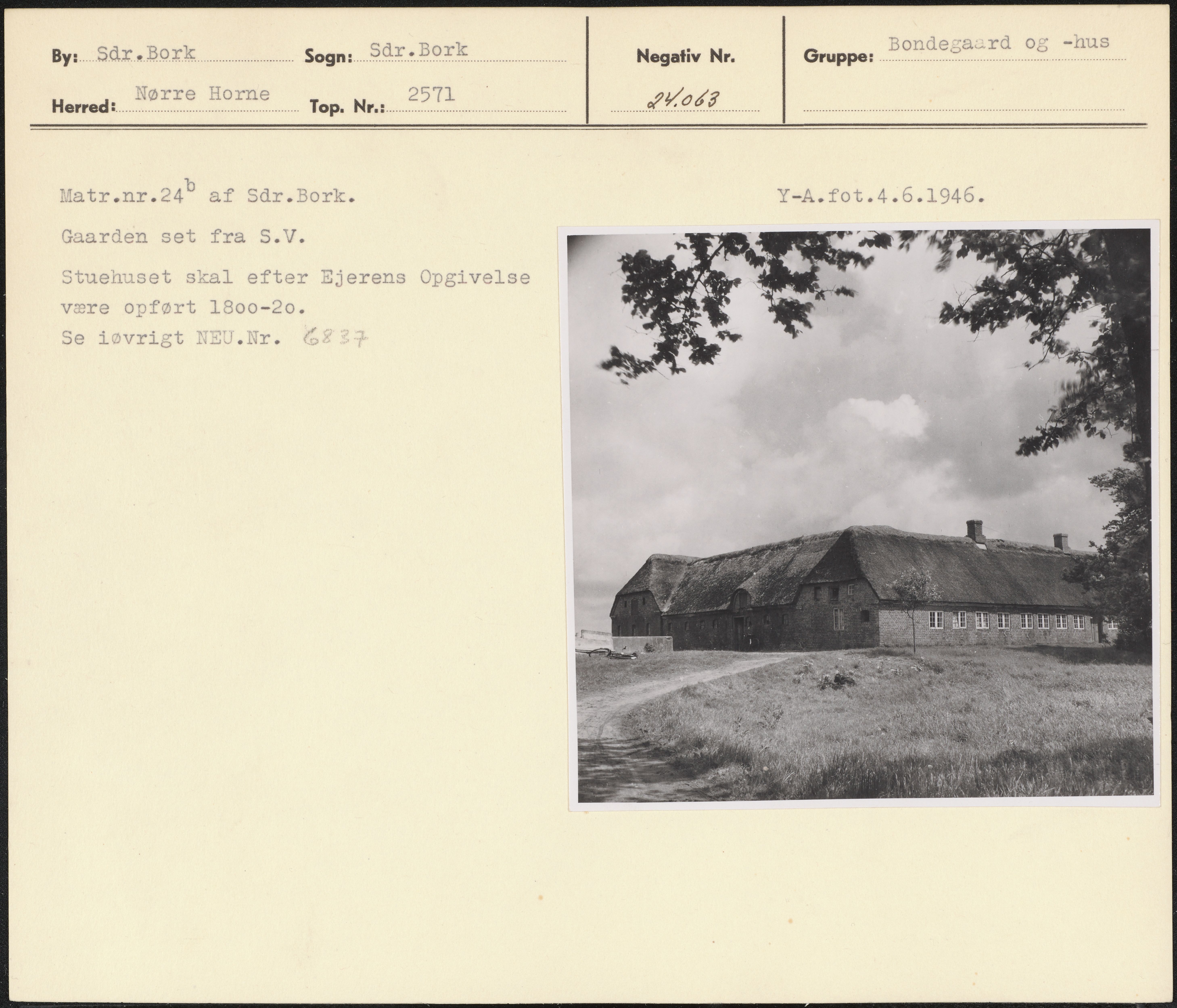 Maskingenkendt tekst fra arkivkort. Matr.nr.249 af Sår.Bork. Y-A.fot.4.6.1946. Gaarden set fra S.V. Stuehuset skal efter Ejerens Opgivelse være opført 1800-20. Se iøvrigt NEU.Nr(227
