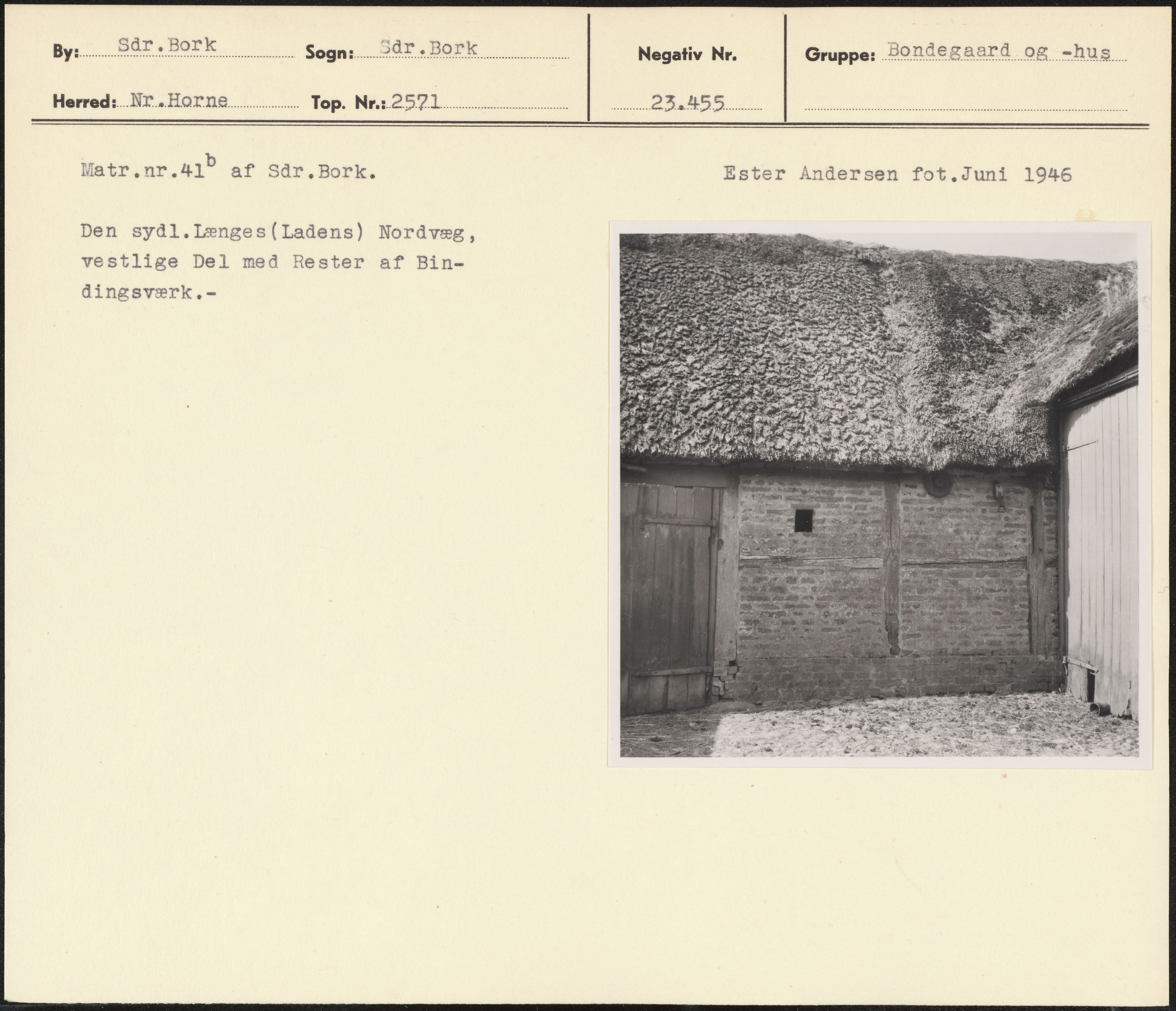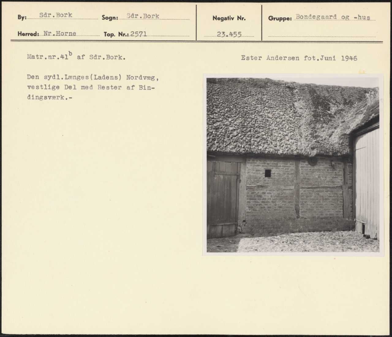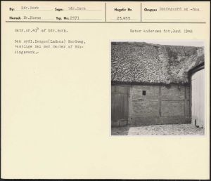 Maskingenkendt tekst fra arkivkort. Matr.nr.419 af sår.Bork. Ester Andersen fot.Juni 1946 Den sydl.længes(Ladens) Nordvæg, vestlige Del med Rester af Bin- dingsværk.
