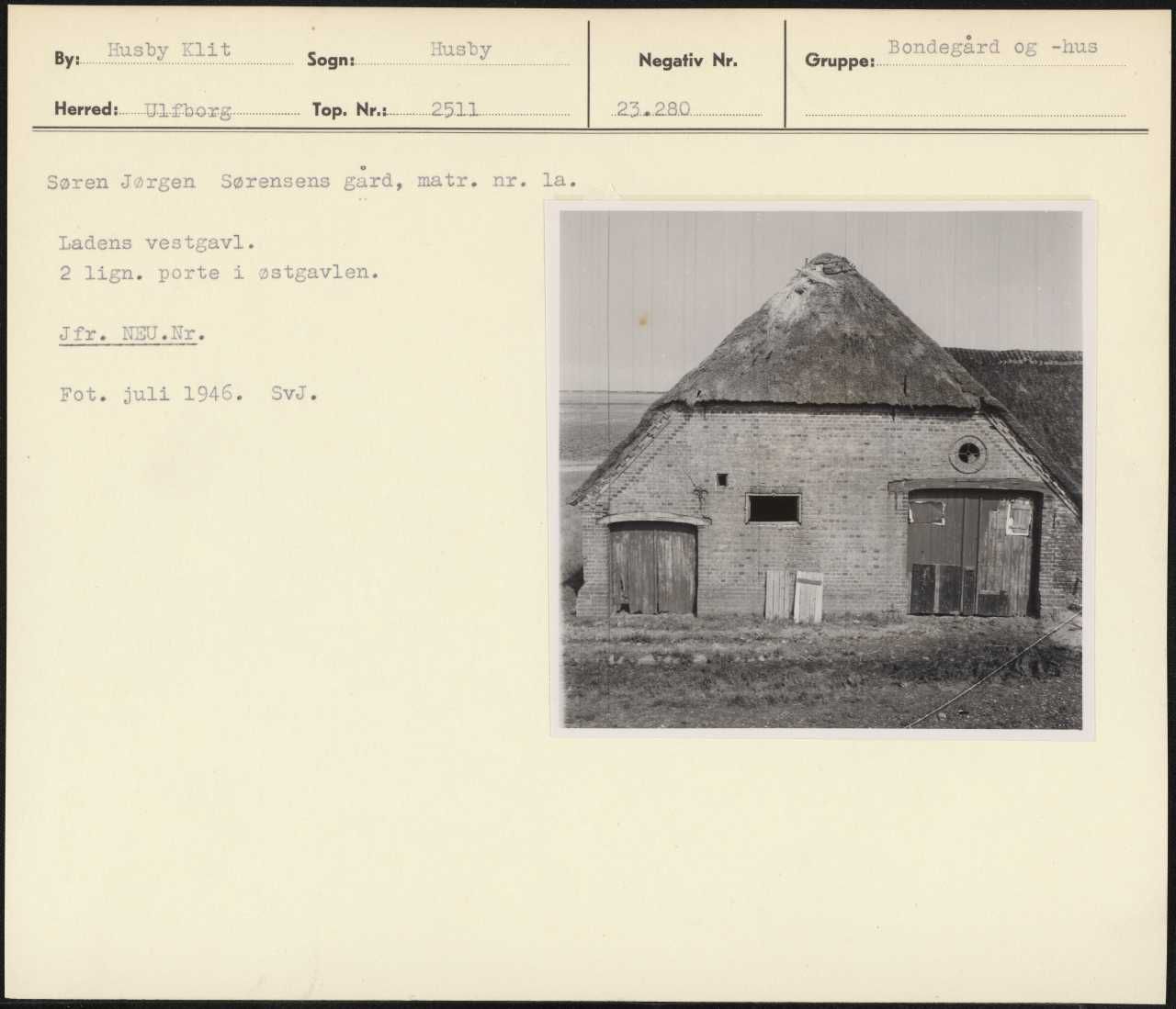Maskingenkendt tekst fra arkivkort. Søren Jørgen Sørensens gard, matr. nr. la. Ladens vestgavl. 2 lign. porte i østgavlen. Jfr. NIU.Nr. Fot. juli 1946. SvJ.