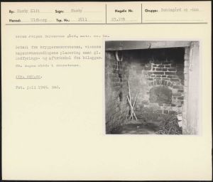 Maskingenkendt tekst fra arkivkort. Søren Jørgen Sørensens gård, matr. nr. la. Detail fra bryggersskorstenen, visende bagerovnsmundingens placering samt gl. indfyrings- og aftrækshul fra bilægger. NB. ingen skøde i skorstenen. Jfr. NEU.Nr. Fot. juli 1946. SvJ.