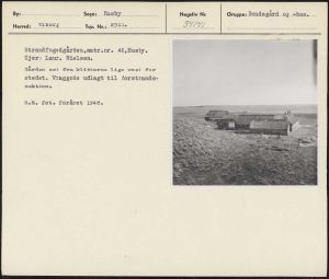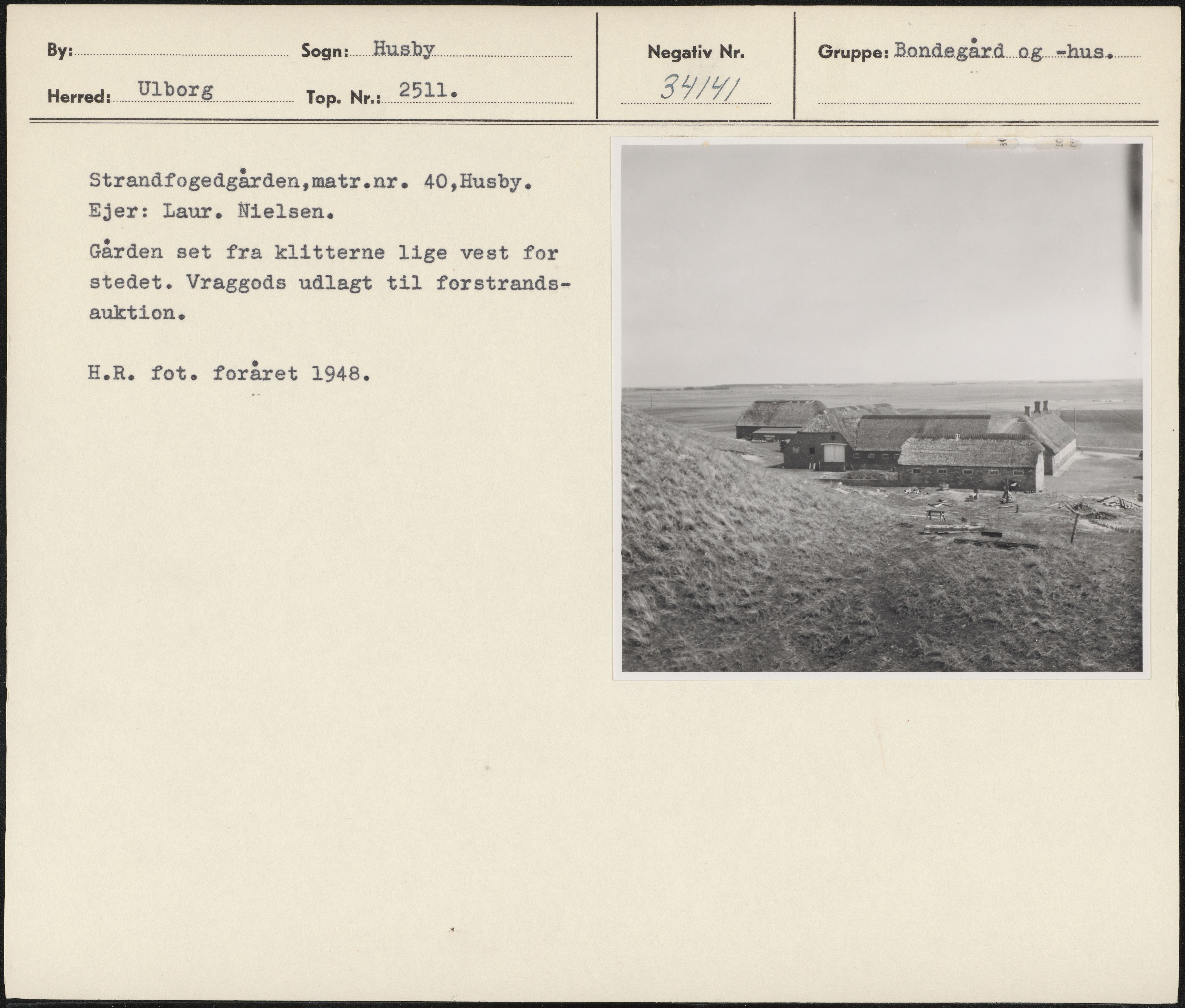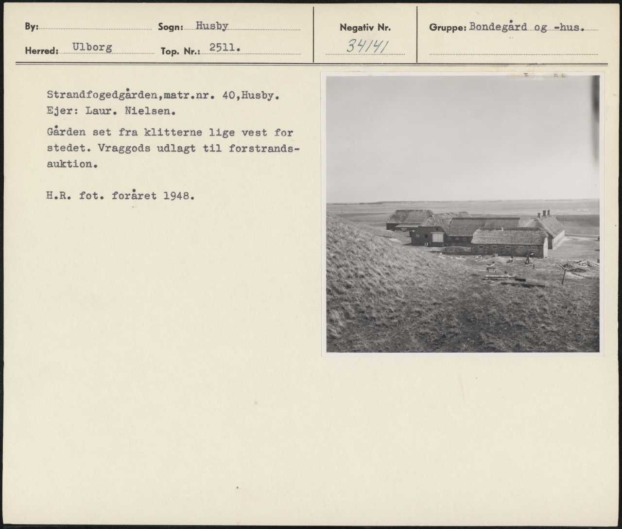 Maskingenkendt tekst fra arkivkort. Strandfogedgården,matr.nr. 40,Husby. Ejer: Laur. Nielsen. Gården set fra klitterne lige vest for stedet. Vraggods udlagt til forstrands- auktion. H.R. fot. foråret 1948.