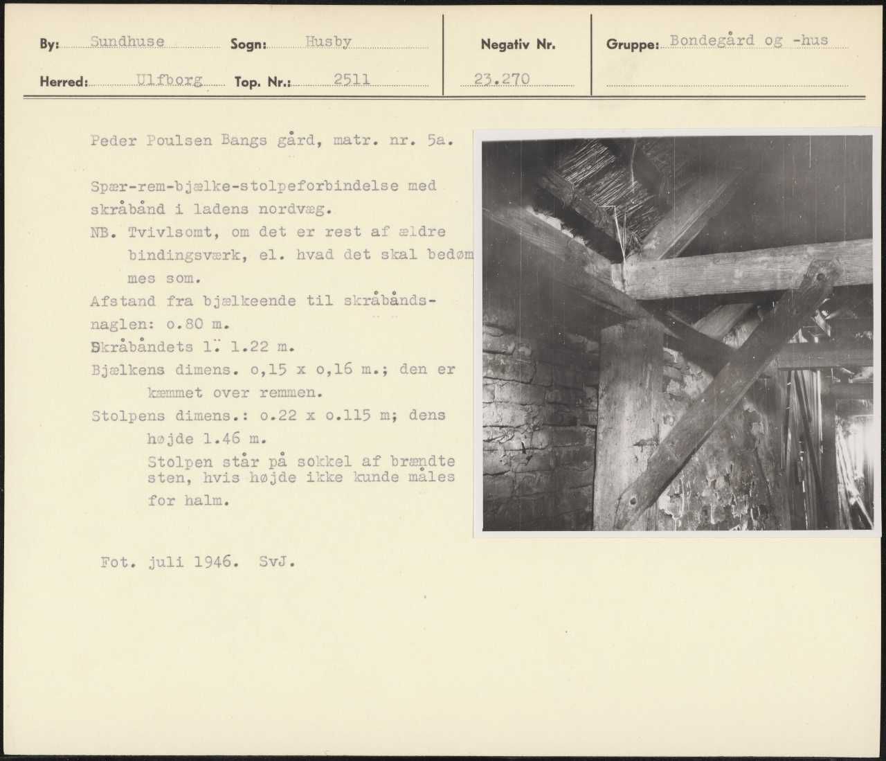 Maskingenkendt tekst fra arkivkort. Peder Poulsen Bangs gård, matr. nr. 52. Spær-rem-bjælke-stolpeforbindelse med skråbånd i ladens nordvæg. NB. Tvivlsomt, om det er rest af ældre bindingsværk, el. hvad det skal bedøn —— mes som. Afstand fra bjælkeende til skråbånds- naglen: 0.80 m. 5 Bkråbåndets 1. 1.22 m. Bjælkens dimens. 0,15 x 0,16 m; den er kæmmet over remmen. Stolpens dimens: 0.22 x 0.115 m; dens højde 1.46 m. Stolpen står på sokkel af brændte sten, hvis højde ikke kunde males for halm. Fot. juli 1946. BSvJ.