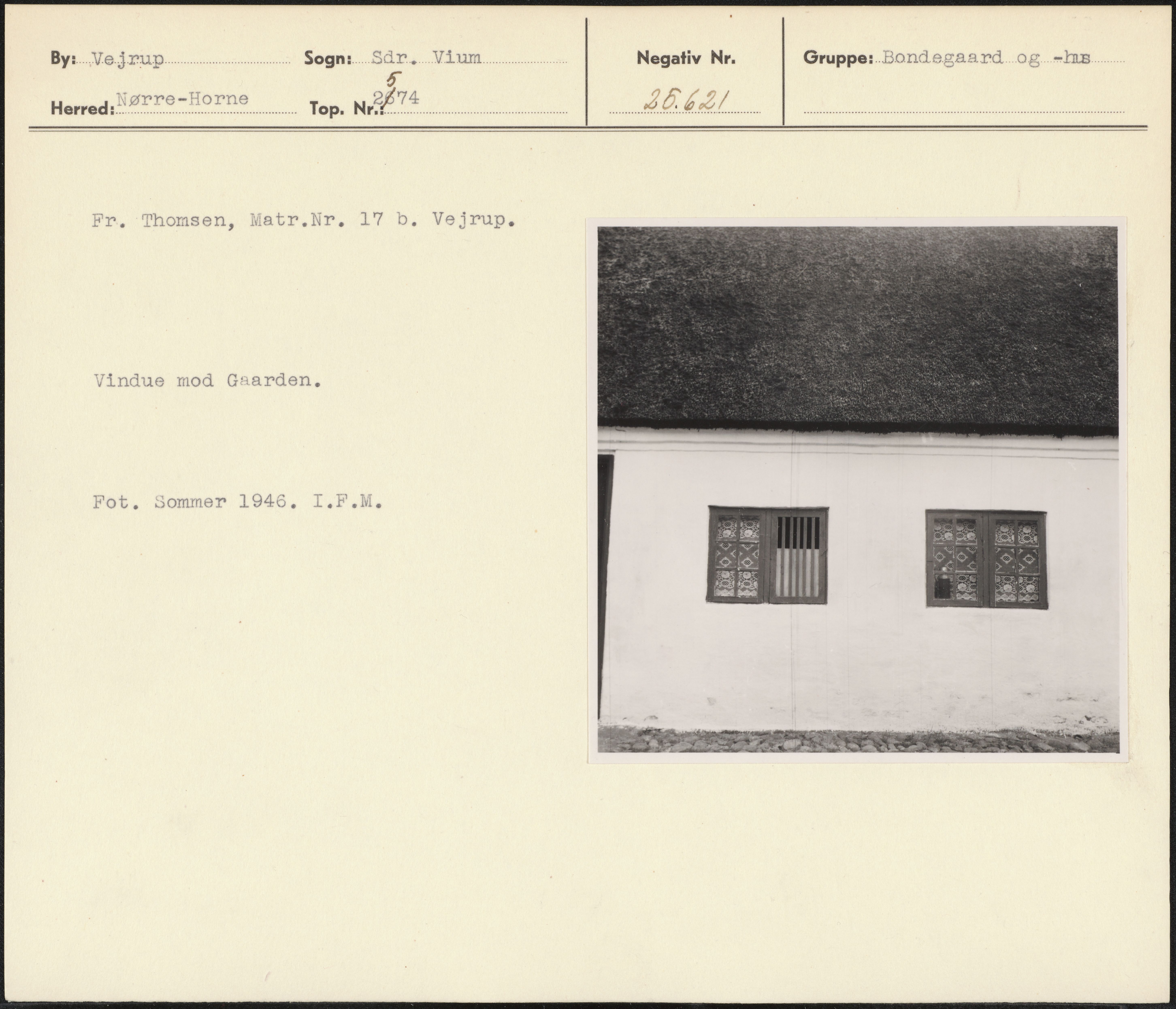 Maskingenkendt tekst fra arkivkort. Fr. Thomsen, Matr.Nr, 17 b. Vejrup. Vindue mod Gaarden, Fot. Sommer 1946, I.F.M.