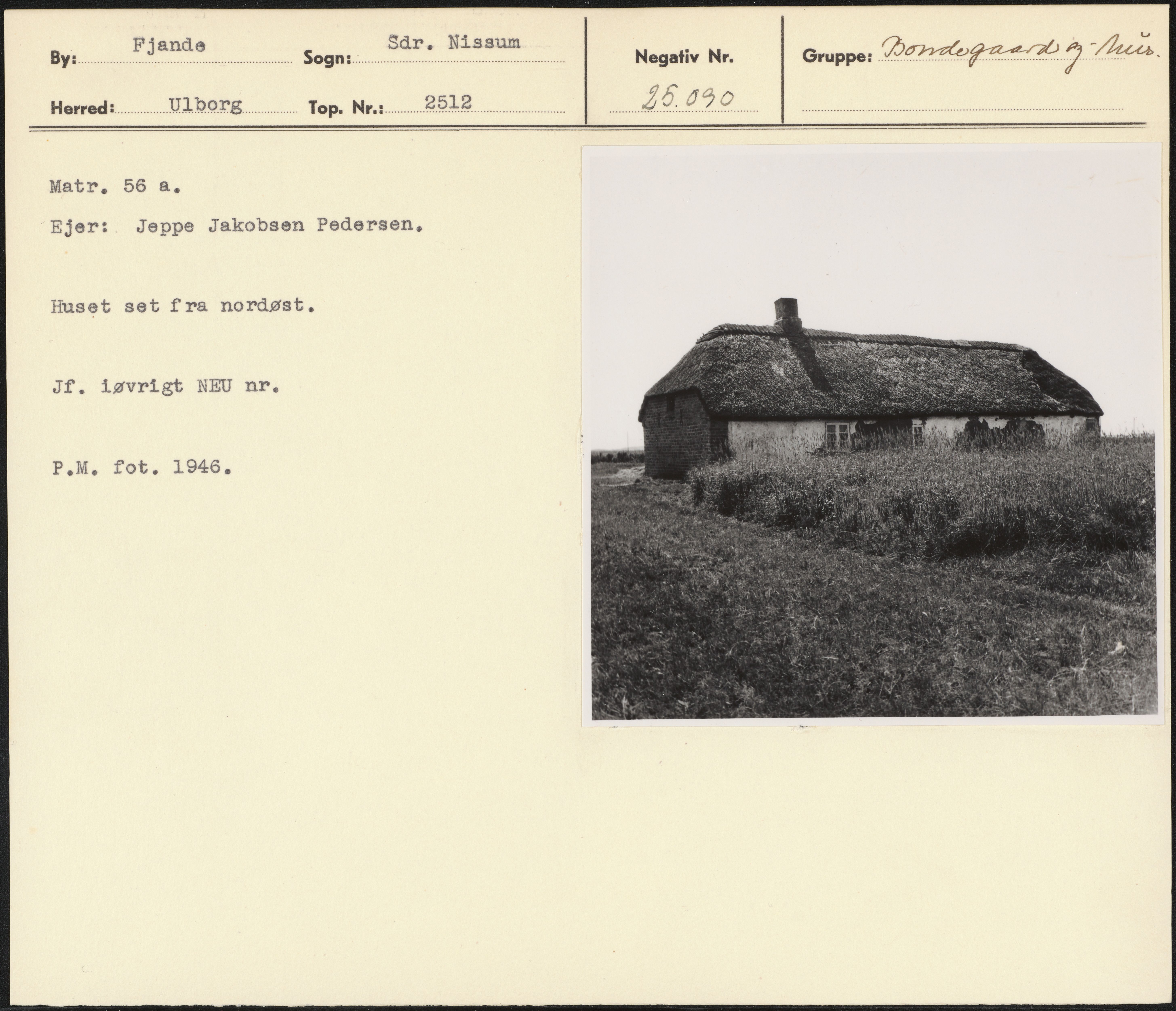 Maskingenkendt tekst fra arkivkort. Matr. 56 a. "Ejer: Jeppe Jakobsen Pedersen, Huset set fra nordøst. Å Jf. iøvrigt NEU nr. P.M. fot, 1946.