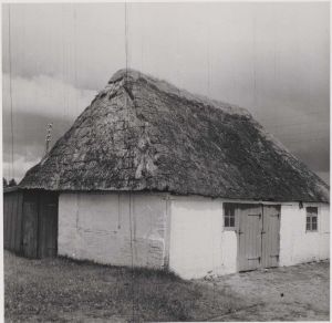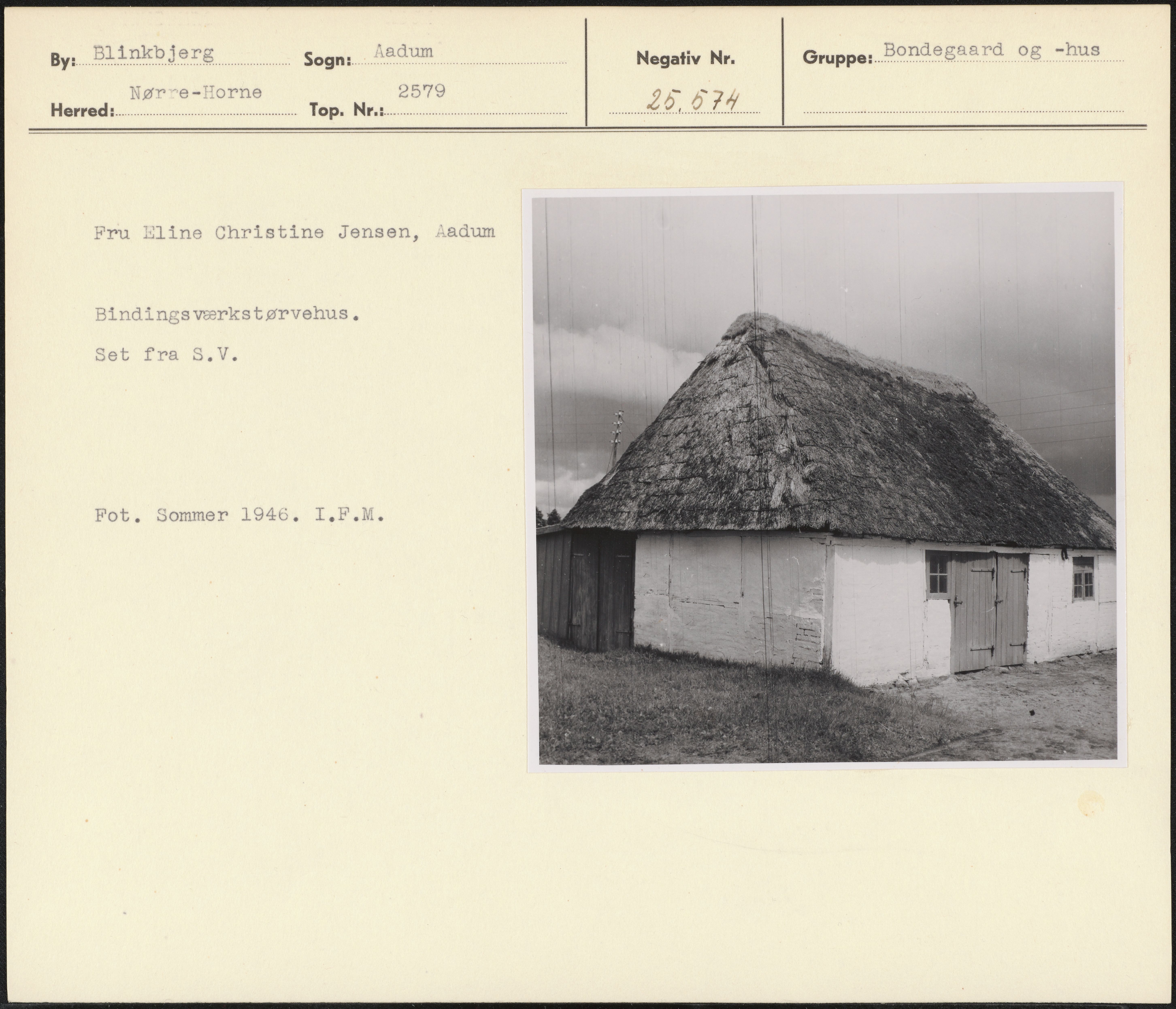 Maskingenkendt tekst fra arkivkort. Fru Eline Christine Jensen, Aadum Bindingsværkstørvehus. Set fra S.V. Fot. Sommer 1946. I.F.M.