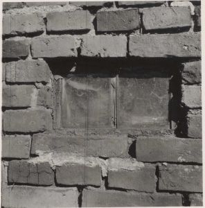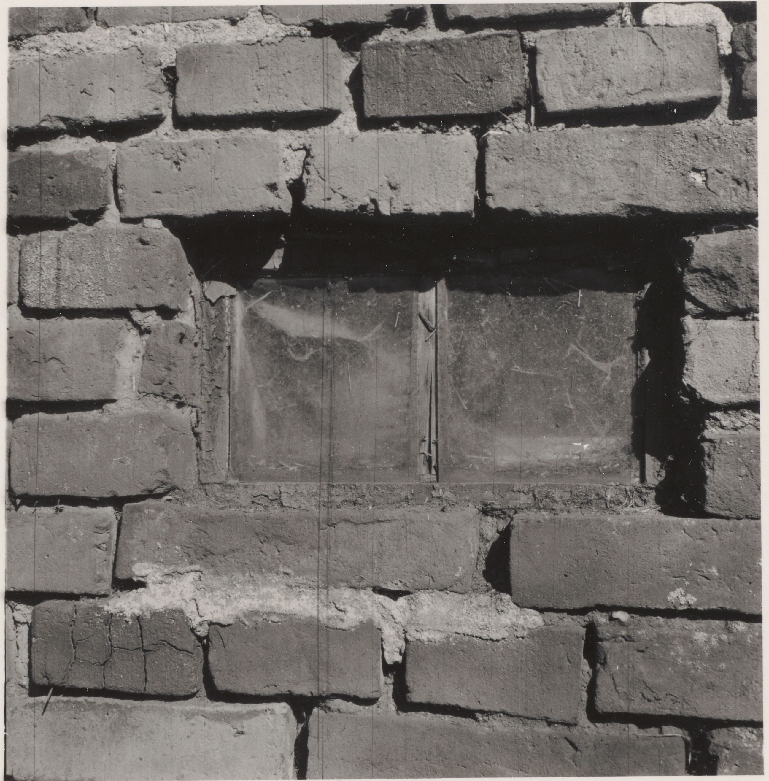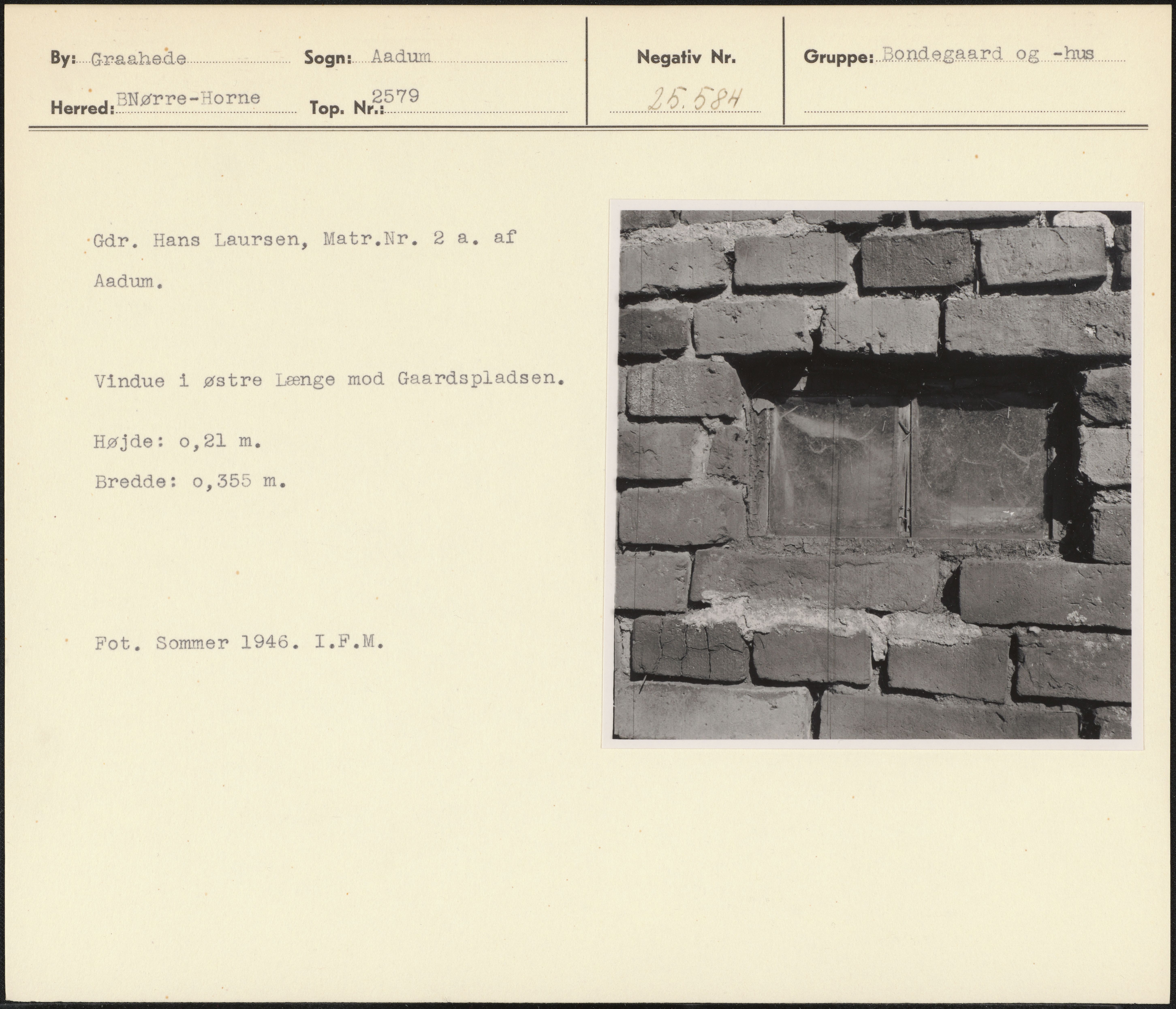 Maskingenkendt tekst fra arkivkort. Går, Hans Laursen, Matr.Nr. 2 a. af Aadum. Vindue 1 østre Længe mod Gaardspladsen. Højde: 0,21 m. Bredde: 0,355 m. - Fot, Sommer 1946. I.F.M,