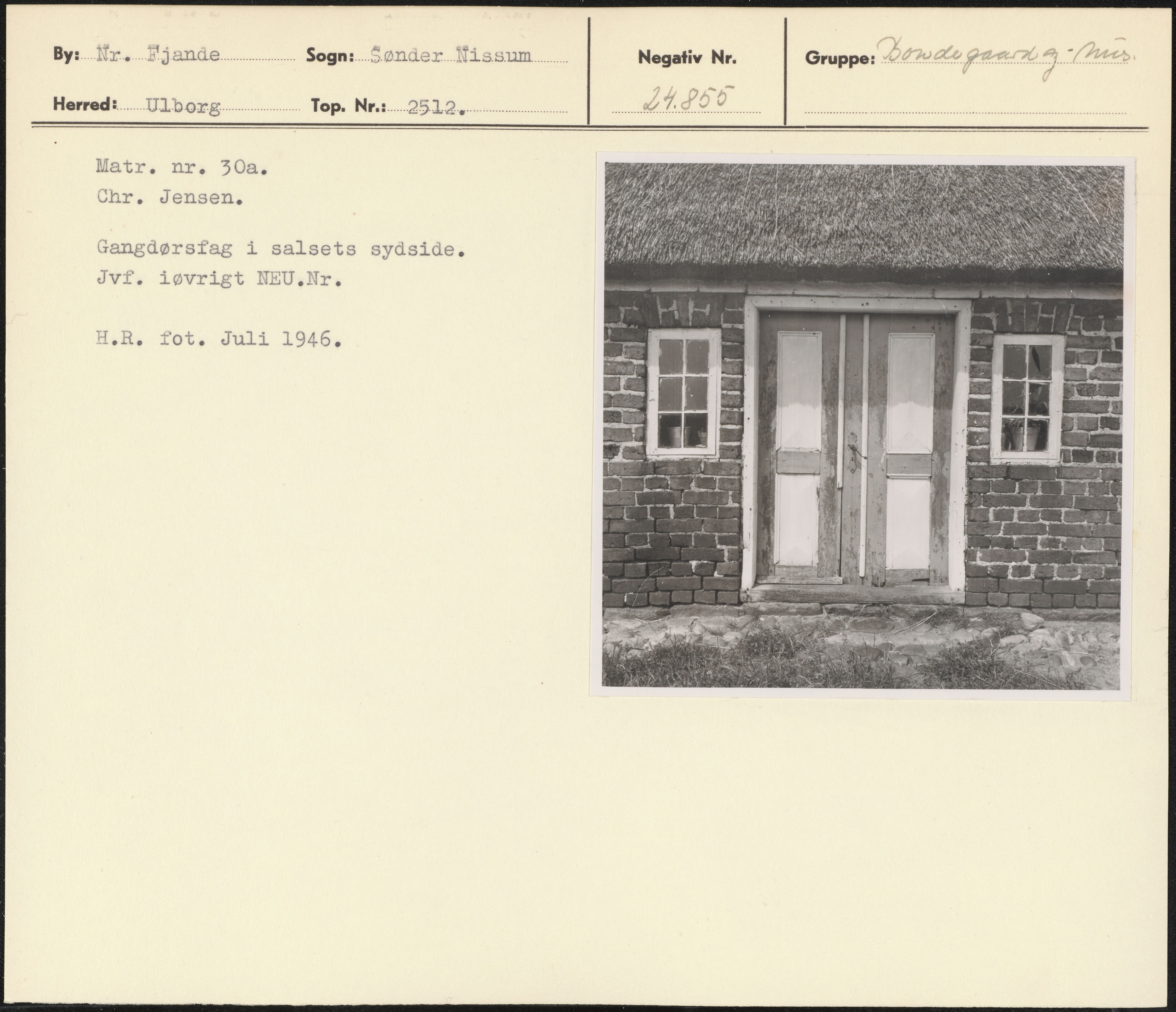 Maskingenkendt tekst fra arkivkort. Matr. nr. 30a. Chr. Jensen. Gangdørsfag 1 salsets sydside. Jvf. iøvrigt NEU.Nr. H.R. fot. Juli 1946.