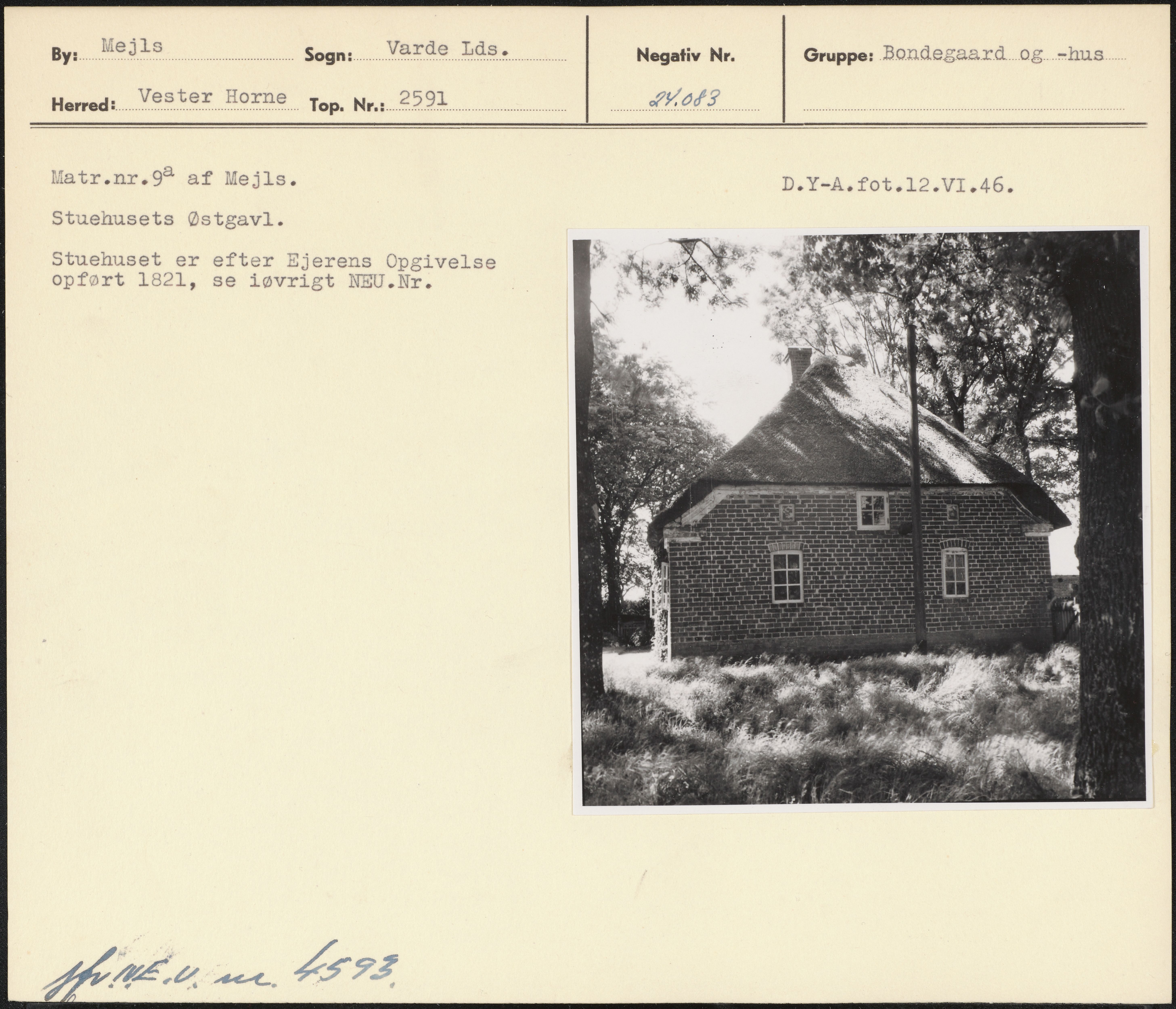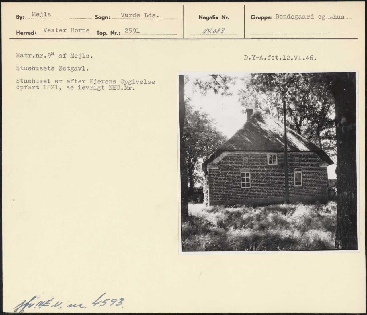 Maskingenkendt tekst fra arkivkort. Matr.nr.9 af Mejls. D.Y-A.fot.12.V1.46. Stuehusets Østgavl. Stuehuset er efter Ejerens Opgivelse opført 1821, se iøvrigt NEU.Nr.