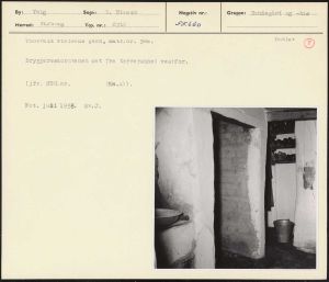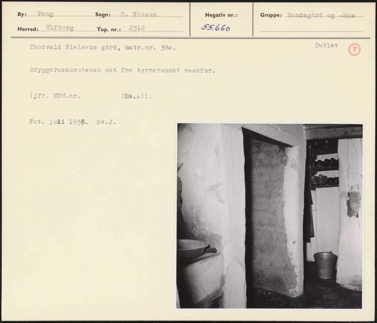 Maskingenkendt tekst fra arkivkort. Thorvald Nielsens gård, matr.nr. 38a; Dublet CT Bryggersskorstenen set fra tørverummet vestfor. (jfr. NEU.nr(Es8.A)). Fot. jukhi 1956. BSv.J.