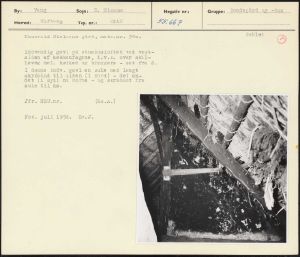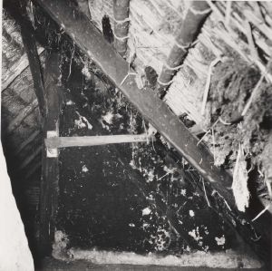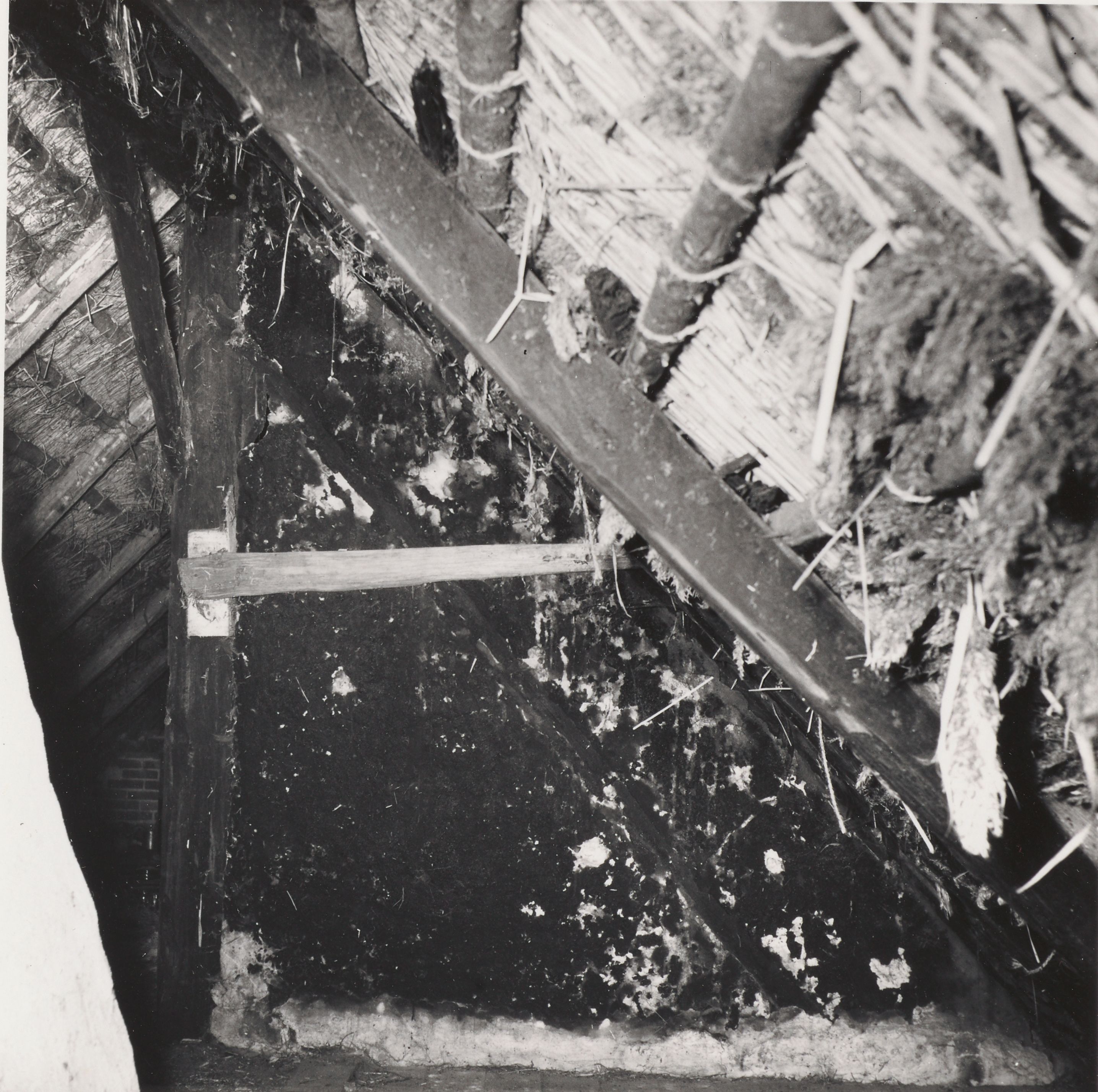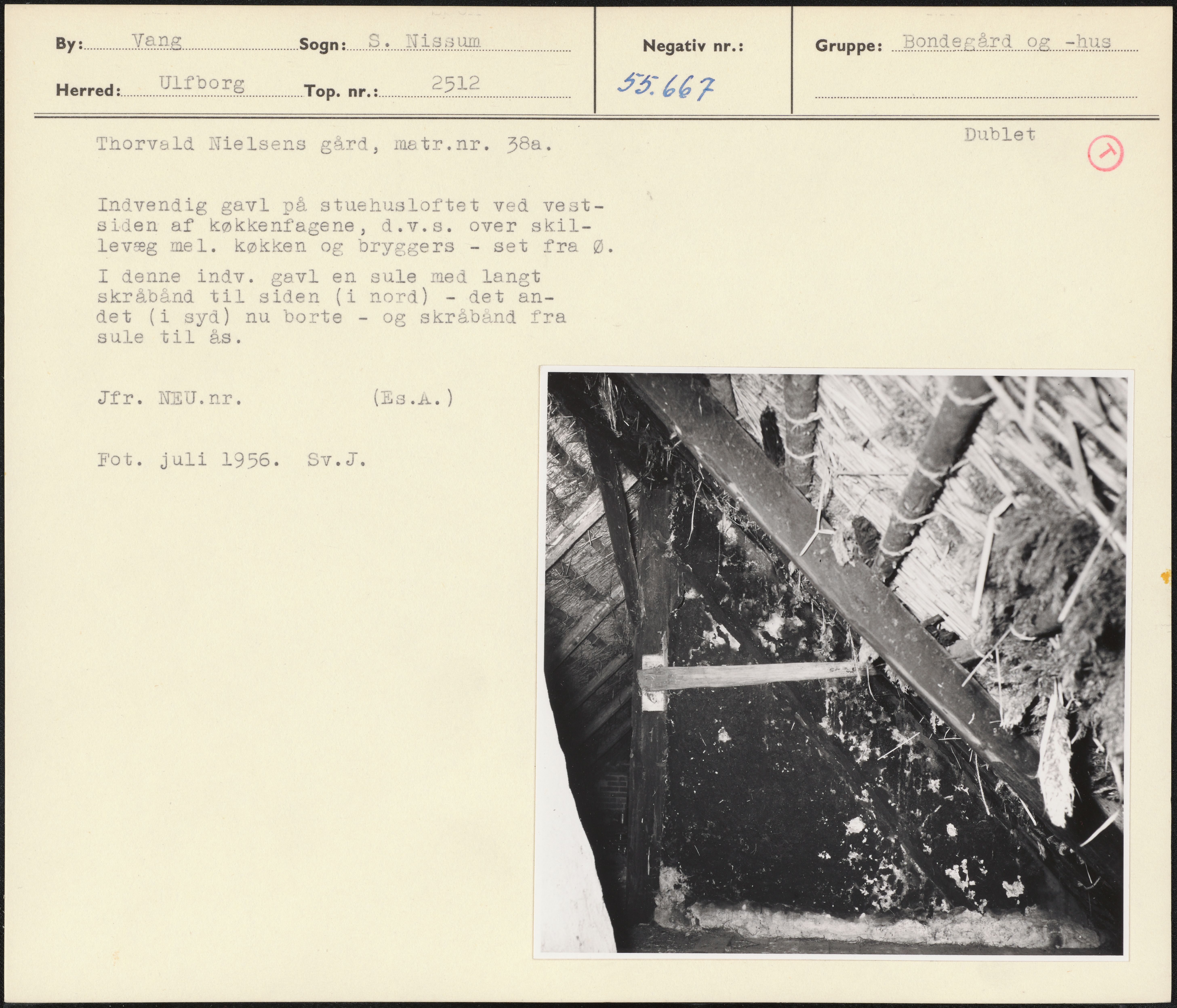 Maskingenkendt tekst fra arkivkort. Thorvsld Nielsens gård, matr.nr. 38a. Dutlaet O Indvendig gavl på stuehusloftet ved vest; siden af køkkenfagene, d.v.s. over skil- levæg mel. køkken og bryggers - set fra Ø. I denne indv. gavl en sule med langt skråbånd til siden (i nord) - det an- det (i syd) nu borte - og skråband fra sule til ås. Jfr. NEU.nr(Es.A) Fot. juli 1956. BSv.J.