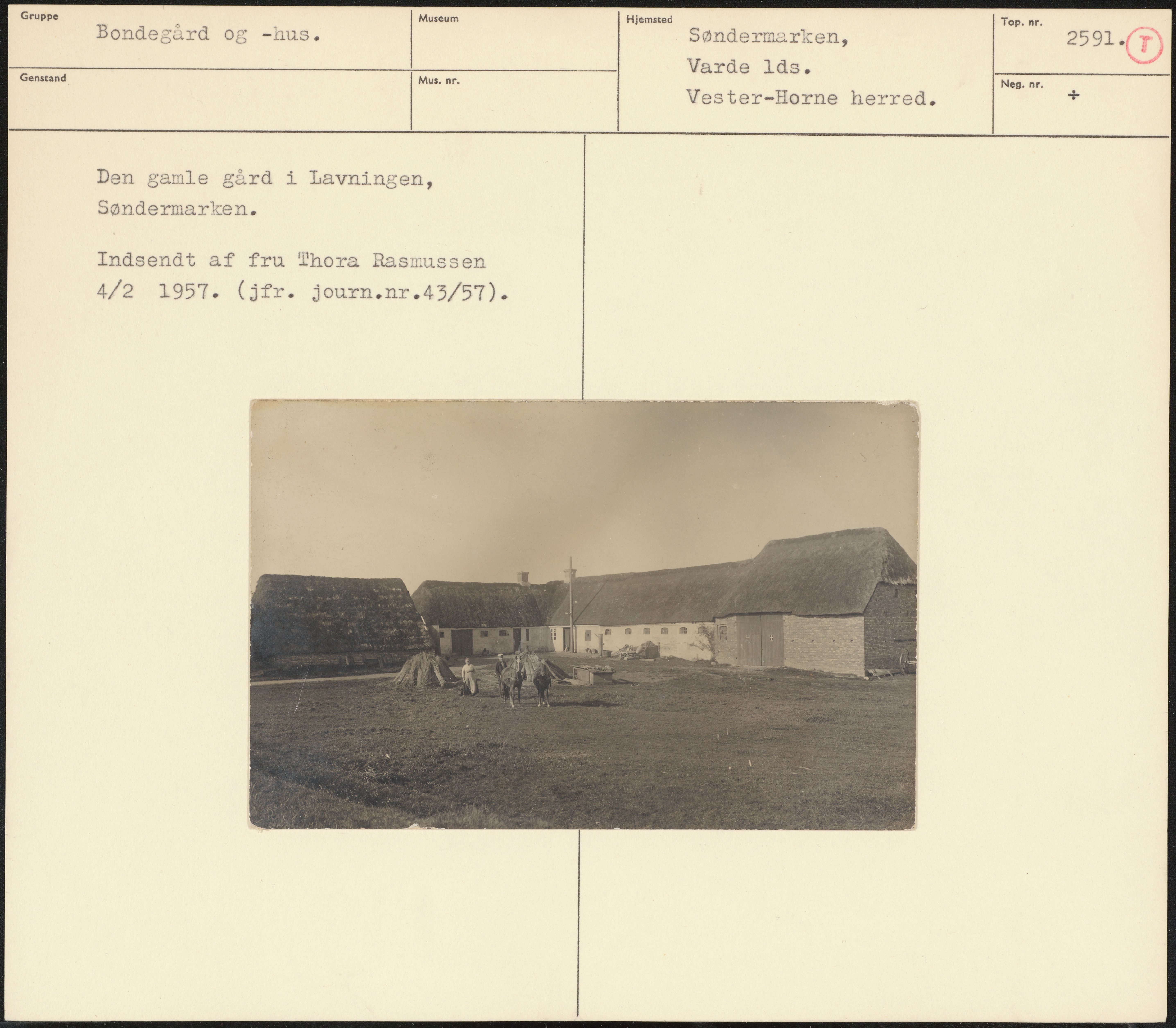 Maskingenkendt tekst fra arkivkort. Den gamle gård i Lavningen, Søndermarken. Indsendt af fru Thora Rasmussen 4/2 1957(jfr. journ.nr.43/57).